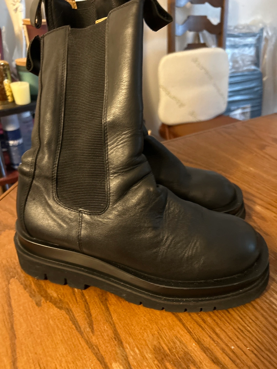 Black leather ankle boots with chunky platform soles and a side zipper. Elastic panel on the back of the boot.