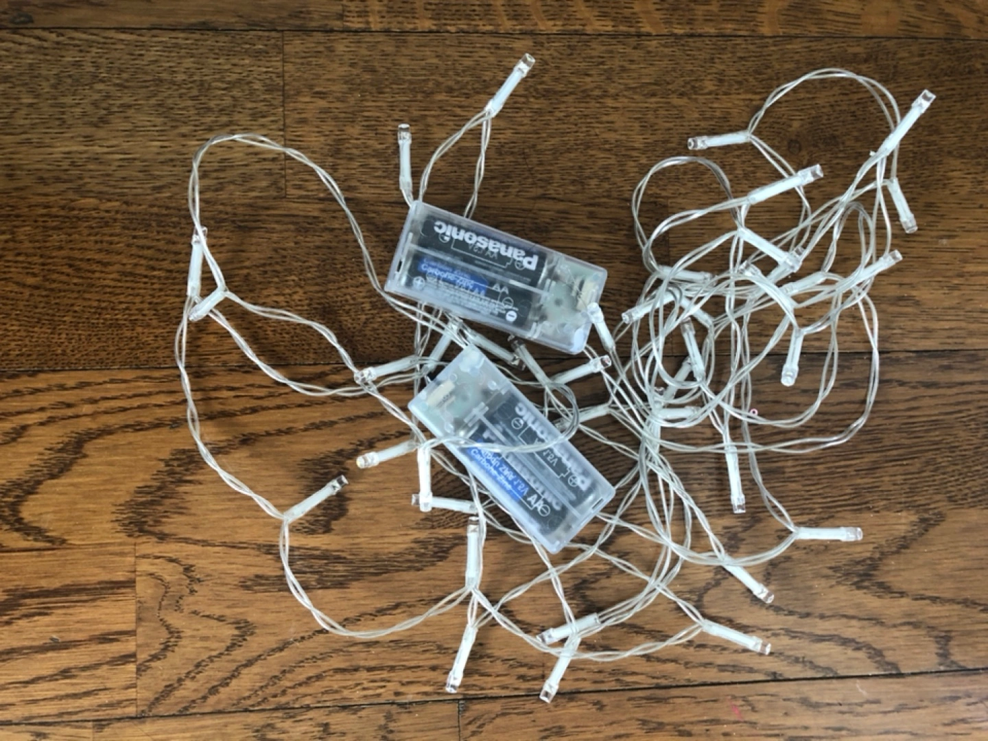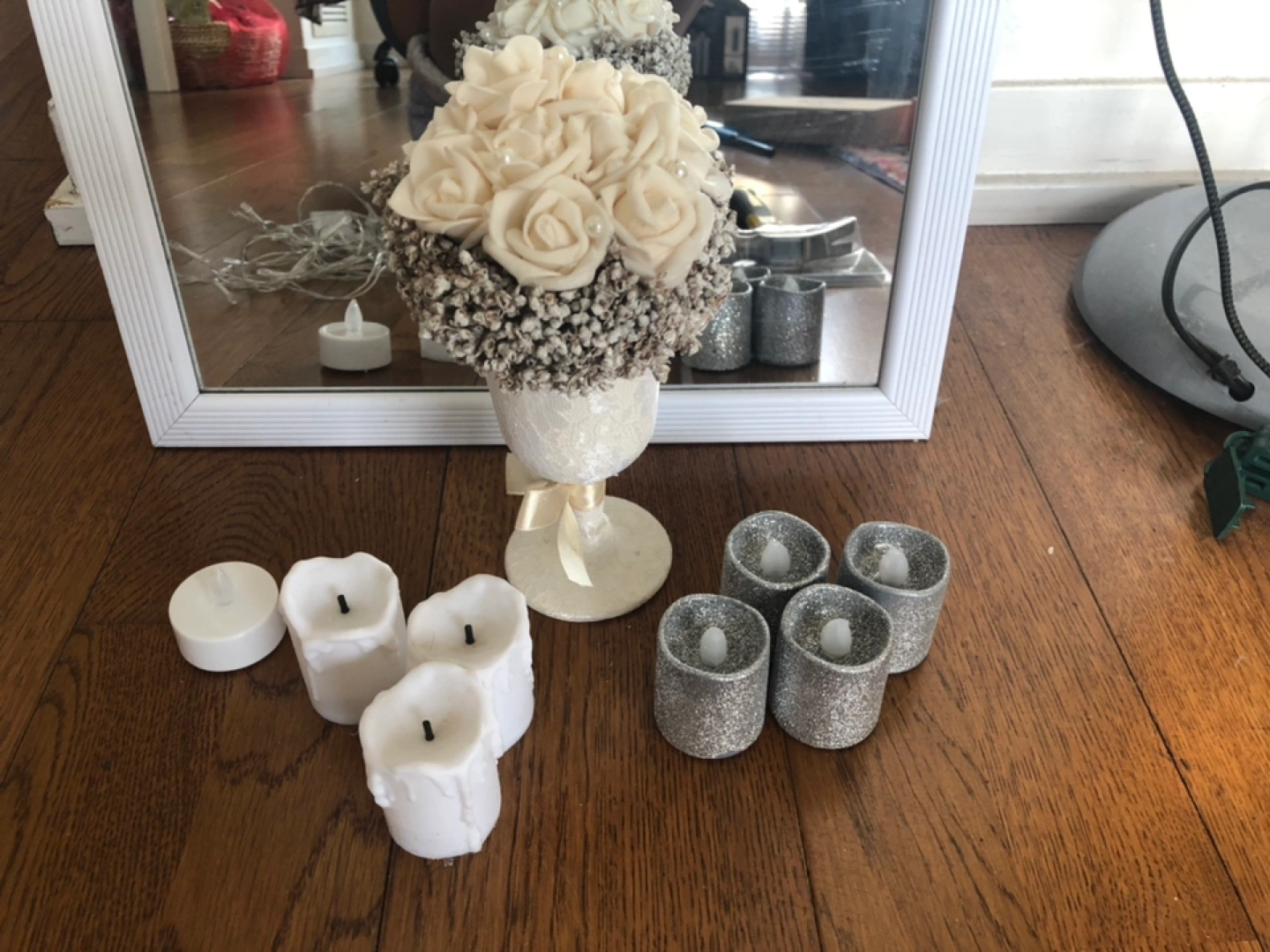 Set of decorative lights and a centerpiece. Includes a floral arrangement in a vase, battery operated tea lights, and string lights. Powered by batteries.