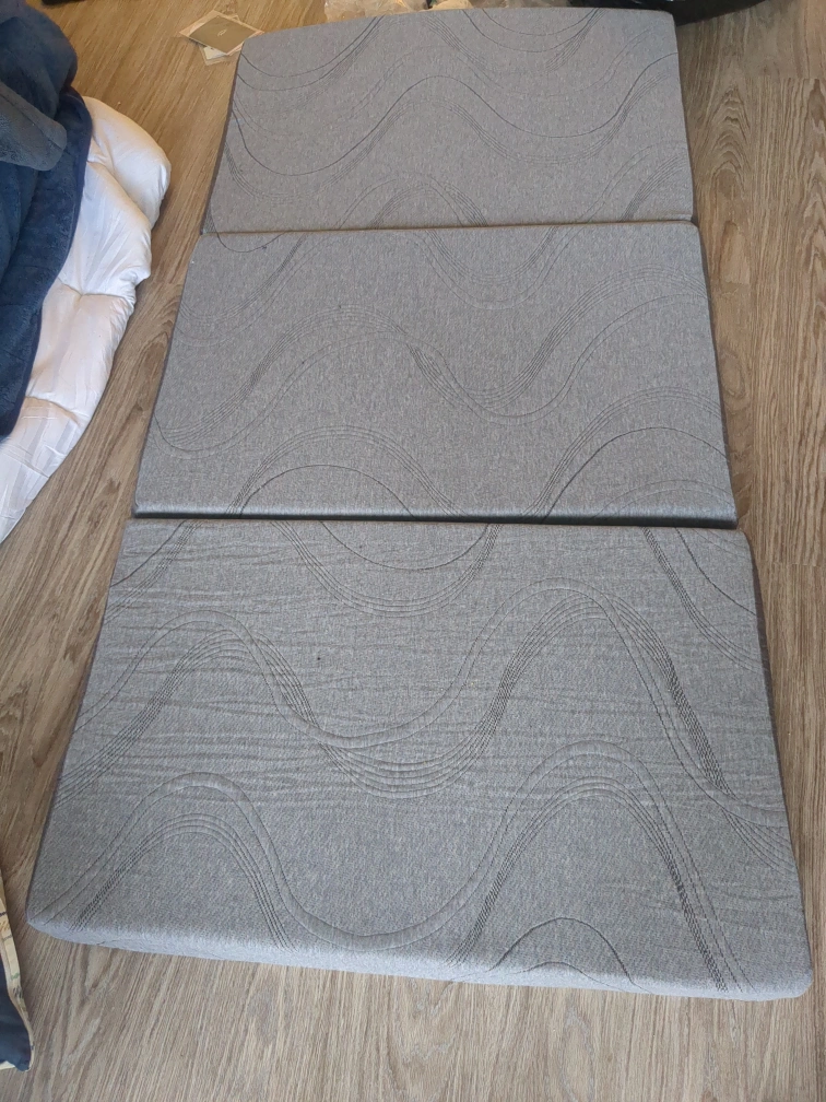 Folding mattress with zipper. Grey fabric with a wavy pattern. Includes tag with brand info.
