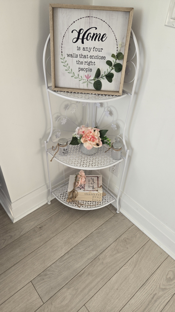 Three-tiered corner shelf. White metal frame with decorative details. Great for displaying decor or storing small items.
