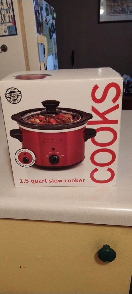 Red slow cooker with removable ceramic pot. Features cool touch handles and a tempered glass lid.