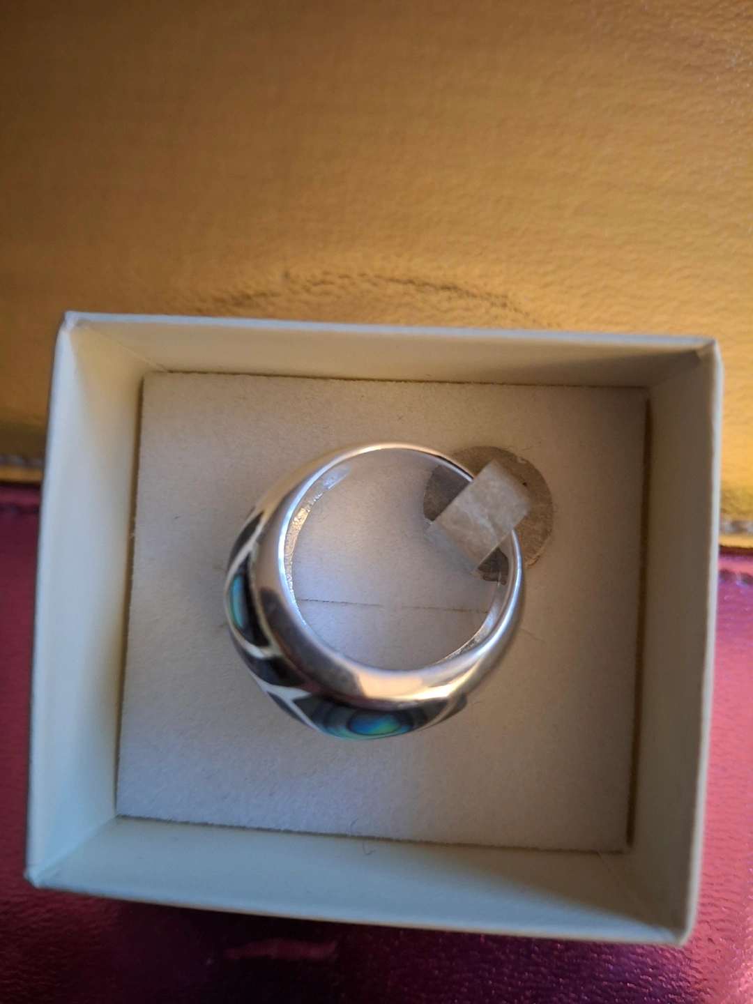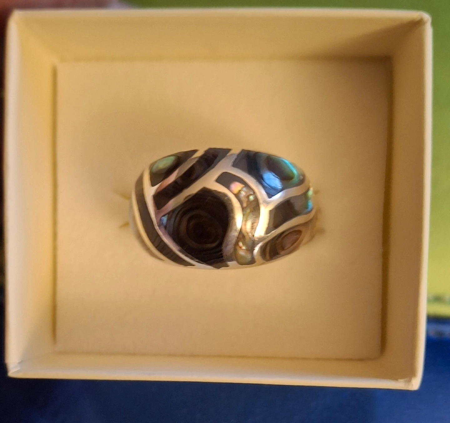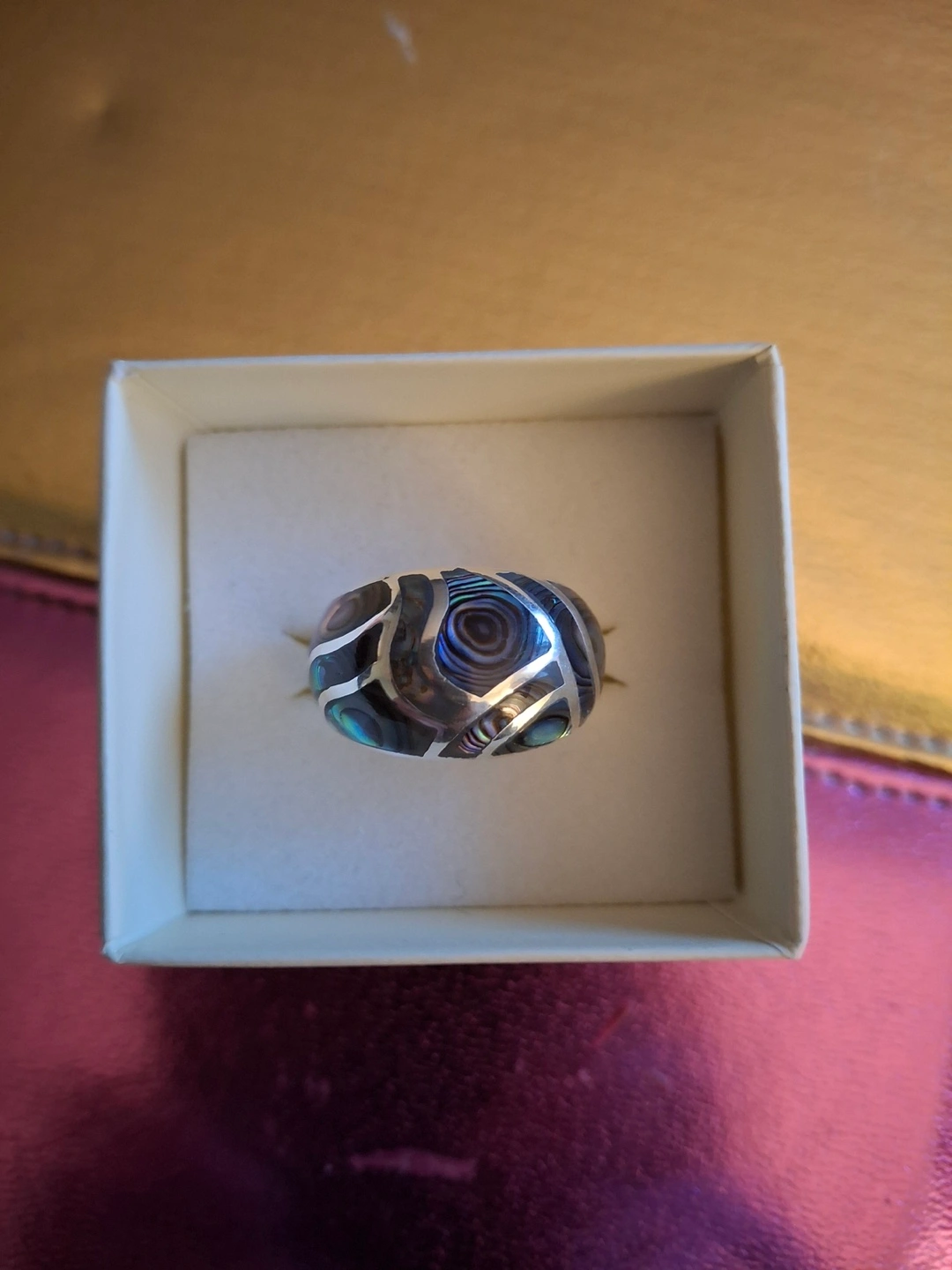Heavy abilone and silver dome ring stamped 925. Tag still on, size 6.3/4. New in box. Available for pickup in Markland Wood.