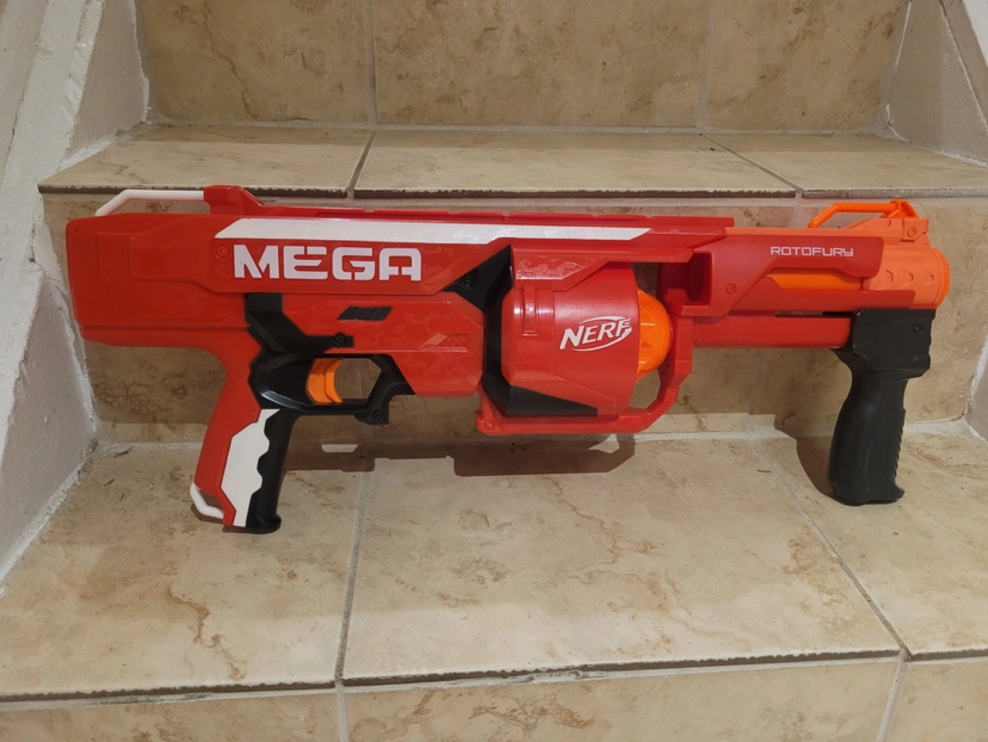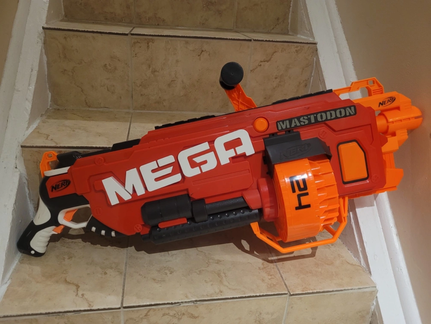 Nerf Mega Mastodon blaster. Includes a drum magazine. Has a rotating barrel. A few darts included.