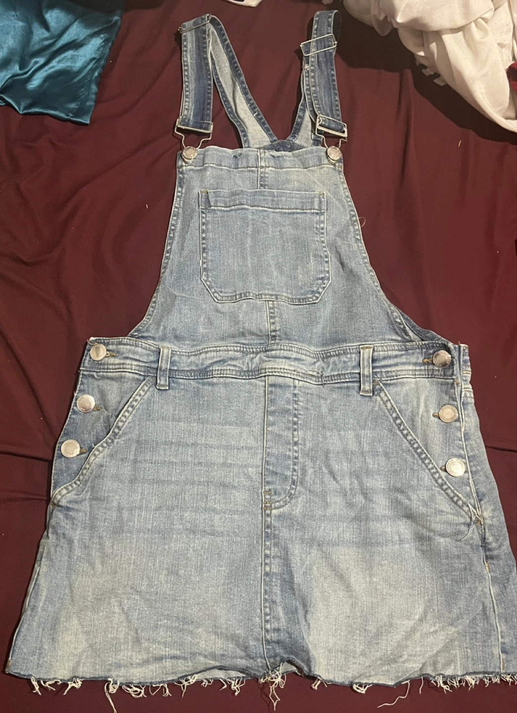 Light wash denim overall skirt. Has a frayed hem. Two large pockets on the front.