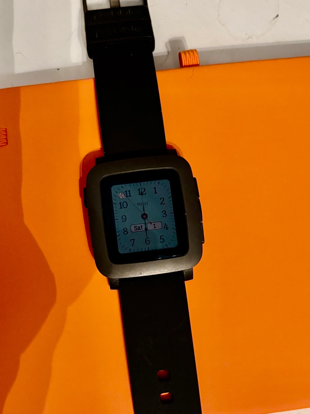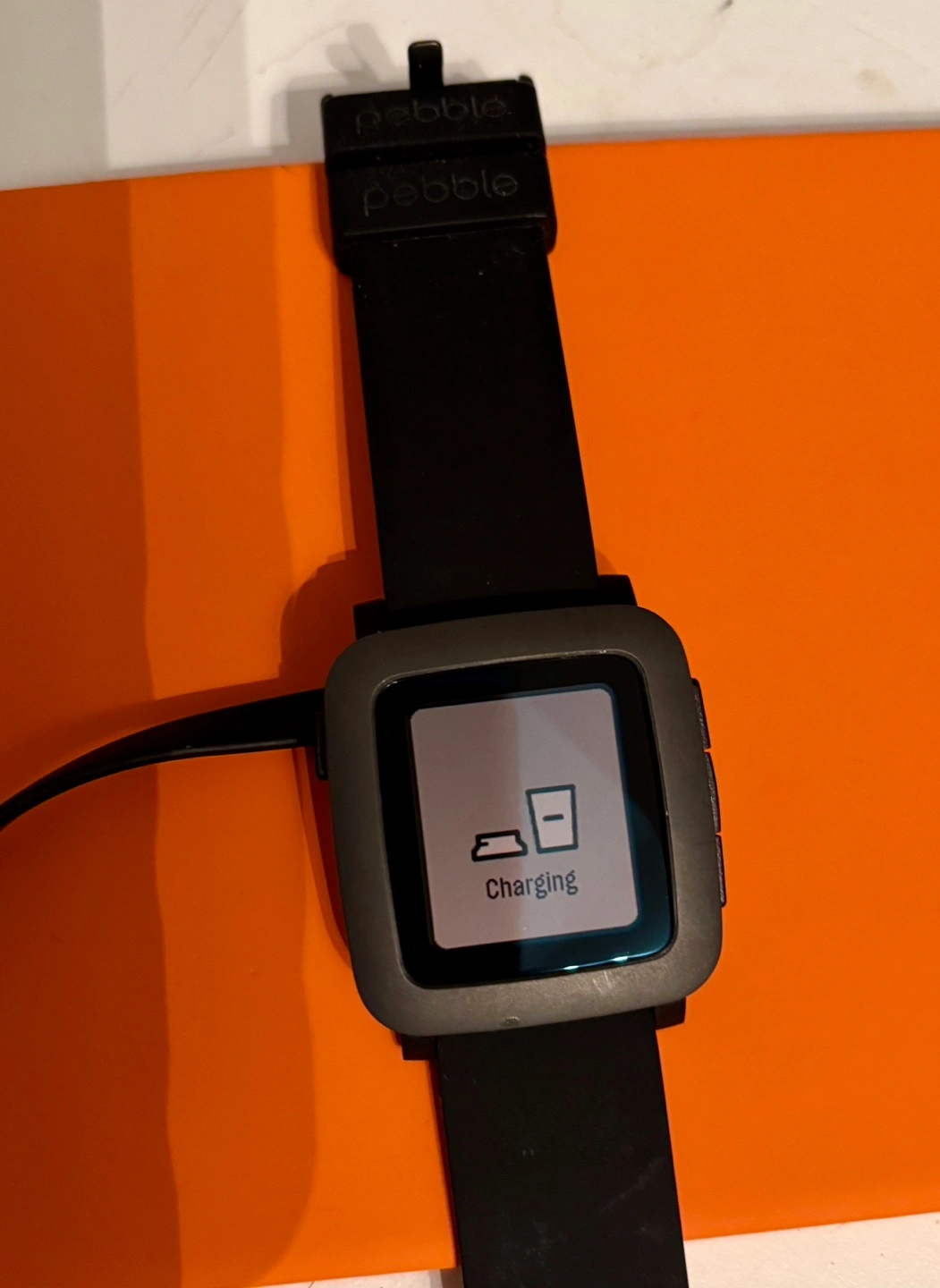 Black Pebble Time smartwatch with black band. Includes charging cable.