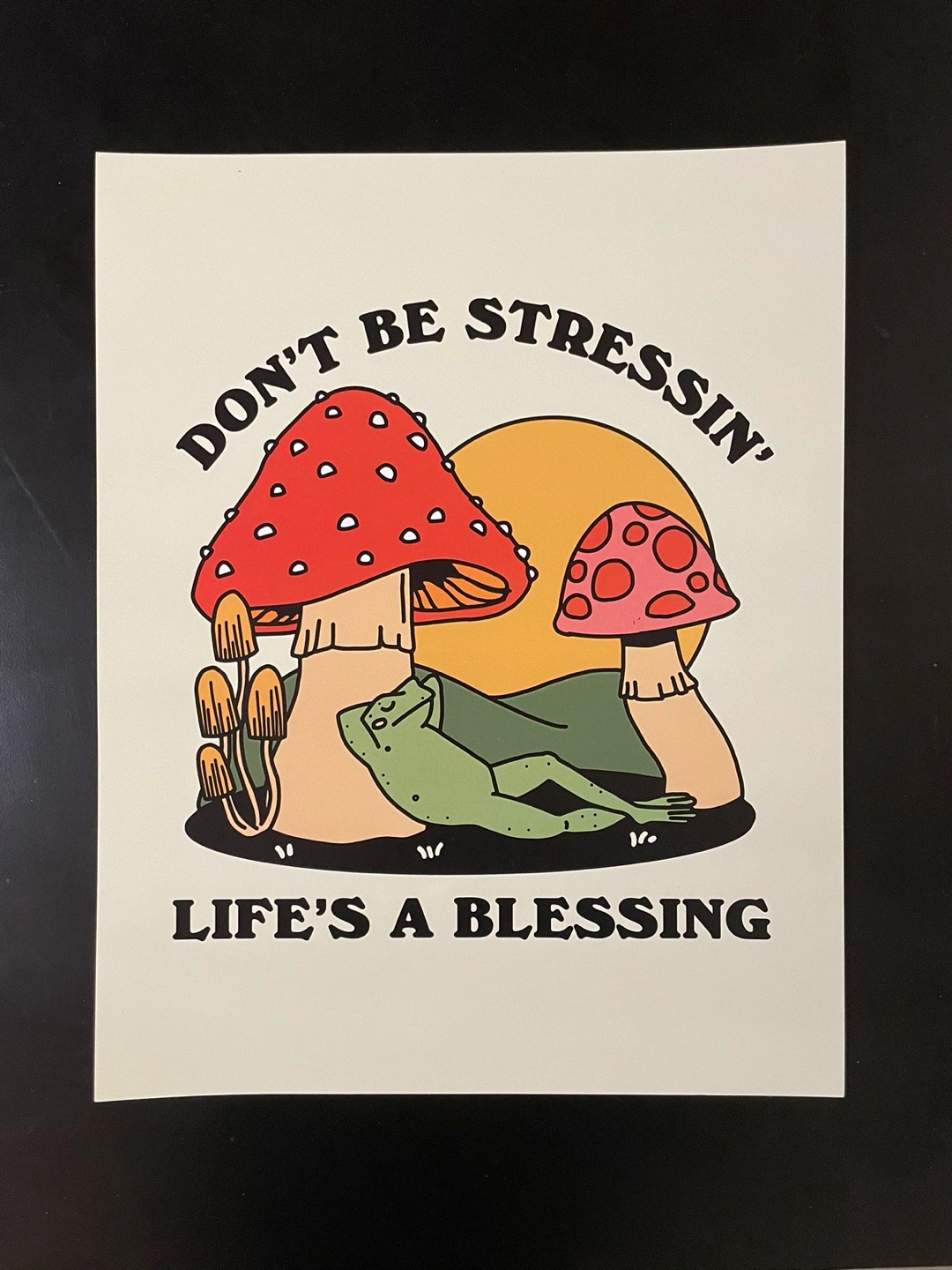Print featuring a frog, mushrooms, and the text 'Don't Be Stressin' Life's a Blessing'. Size: 11x14 inches, premium matte paper Love the print but don’t have anywhere to put it anymore so I’m looking to trade. Doesn’t come with frame but great for home decor. Got it for $25 on Etsy.