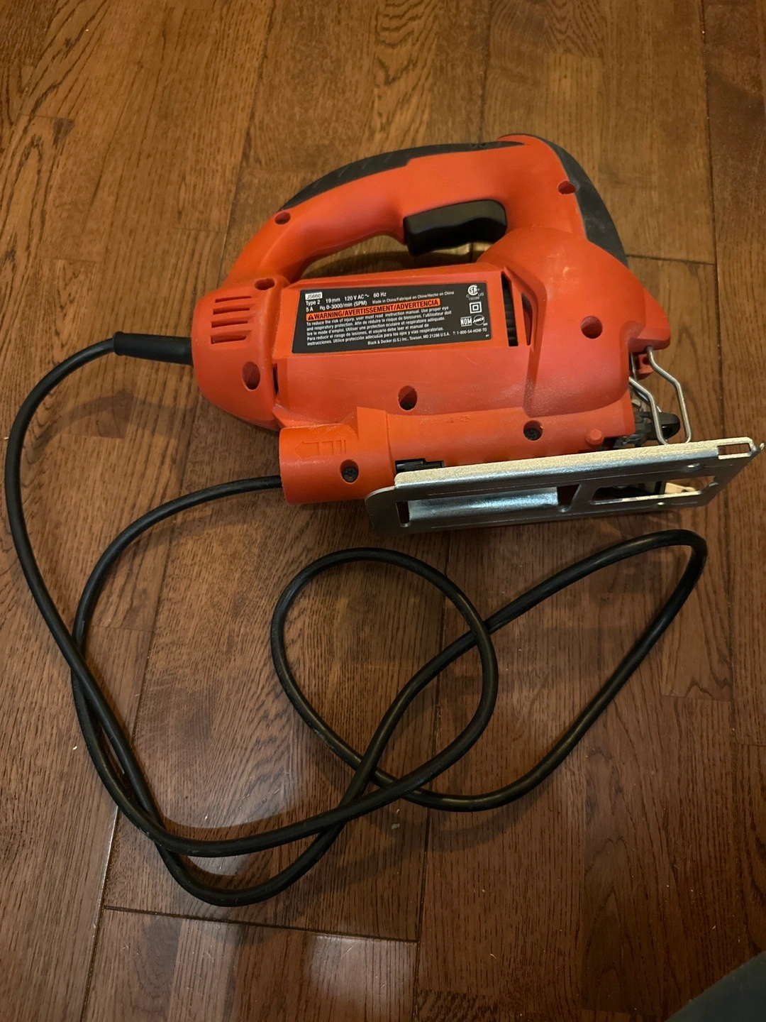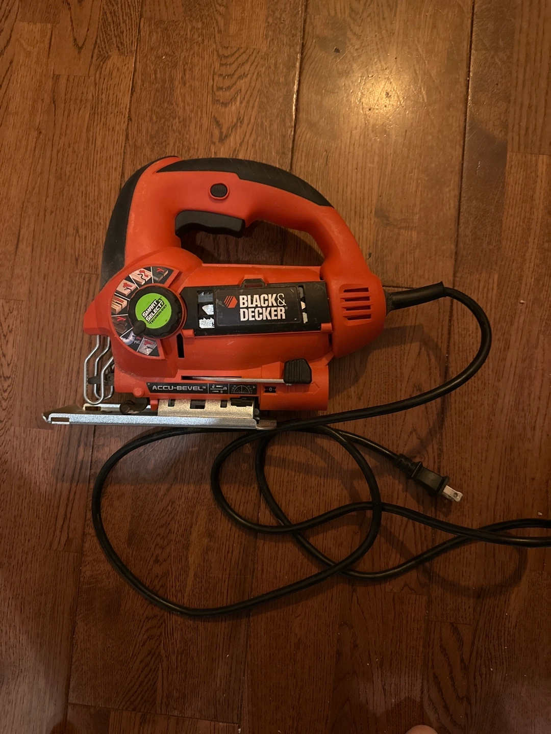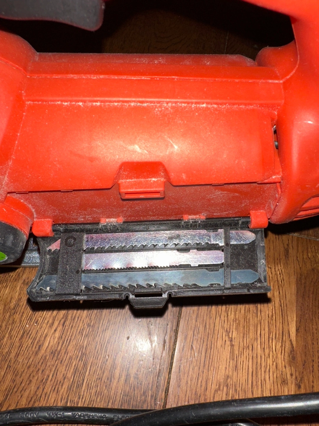 Corded jigsaw with blade storage. Includes 3 blades, 2 wood 1 metal. Includes easily adjustable settings for different materials and a button to keep the trigger engaged, helping to avoid fatigue. Has a dust port and adjustable base +/- 45°.