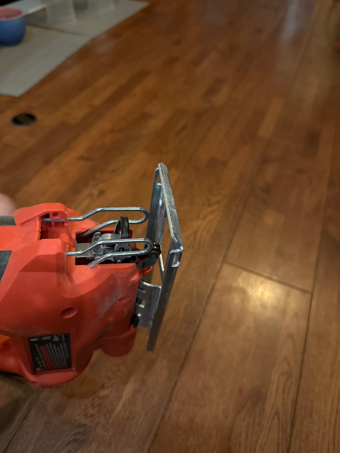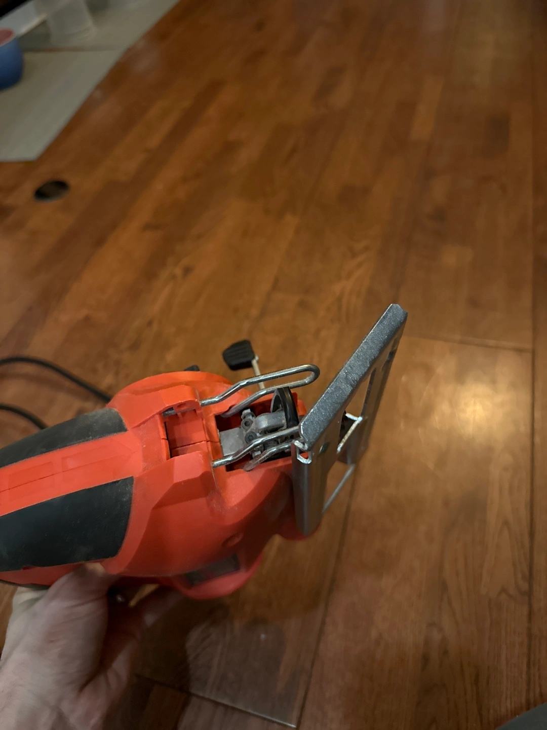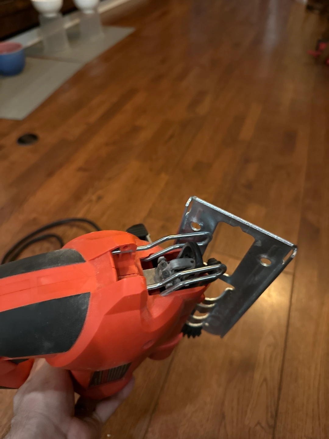 Corded jigsaw with blade storage. Includes 3 blades, 2 wood 1 metal. Includes easily adjustable settings for different materials and a button to keep the trigger engaged, helping to avoid fatigue. Has a dust port and adjustable base +/- 45°.