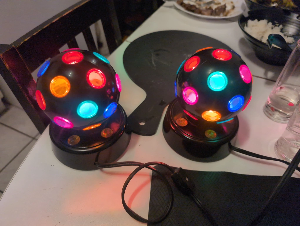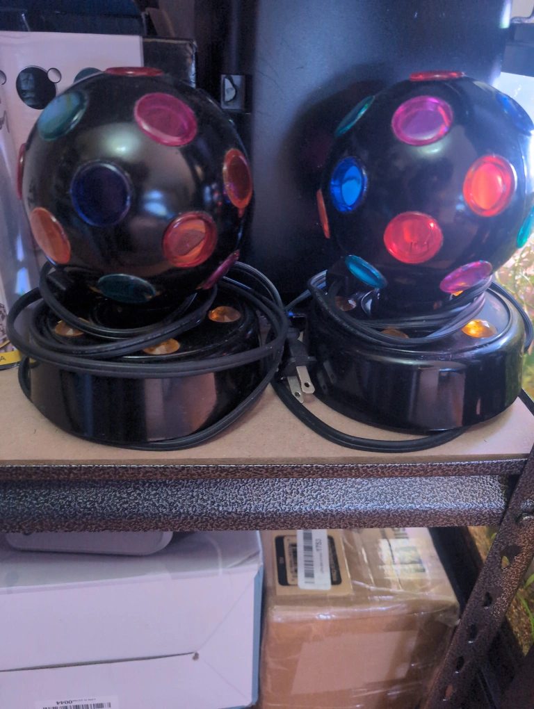 411Two vintage disco balls with coloured lights, comes with cords and plugs. Both work.