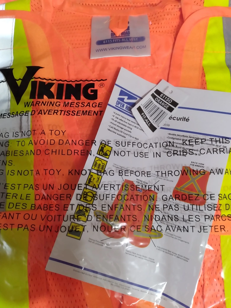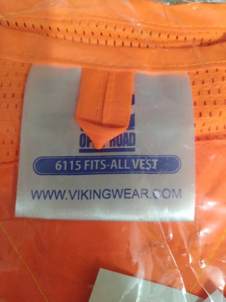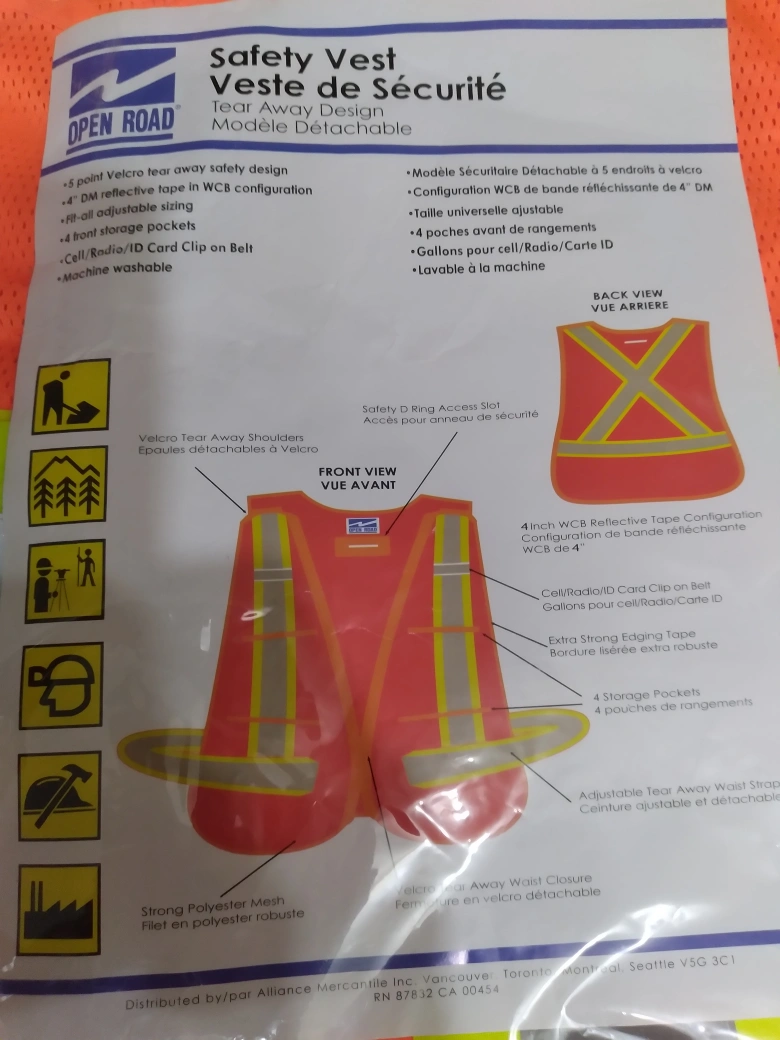 Safety vest, tear away design. Features reflective tape, pockets and a safety ring access slot. Machine washable. Fits All.Never Worn Brand New in Package pickup only