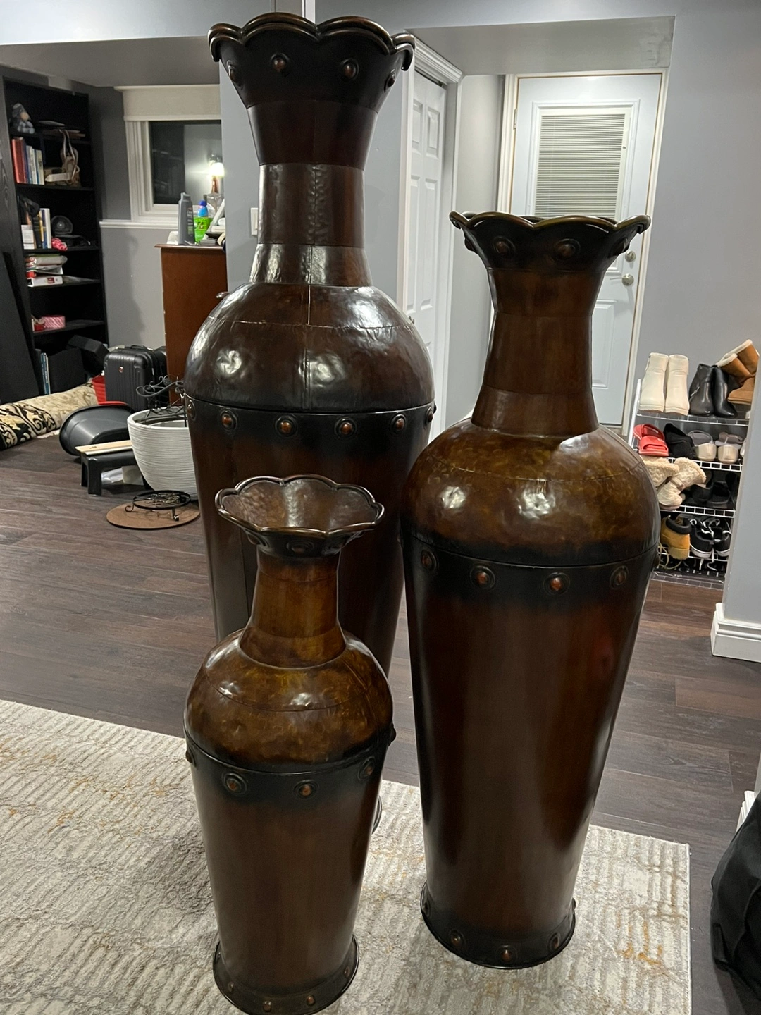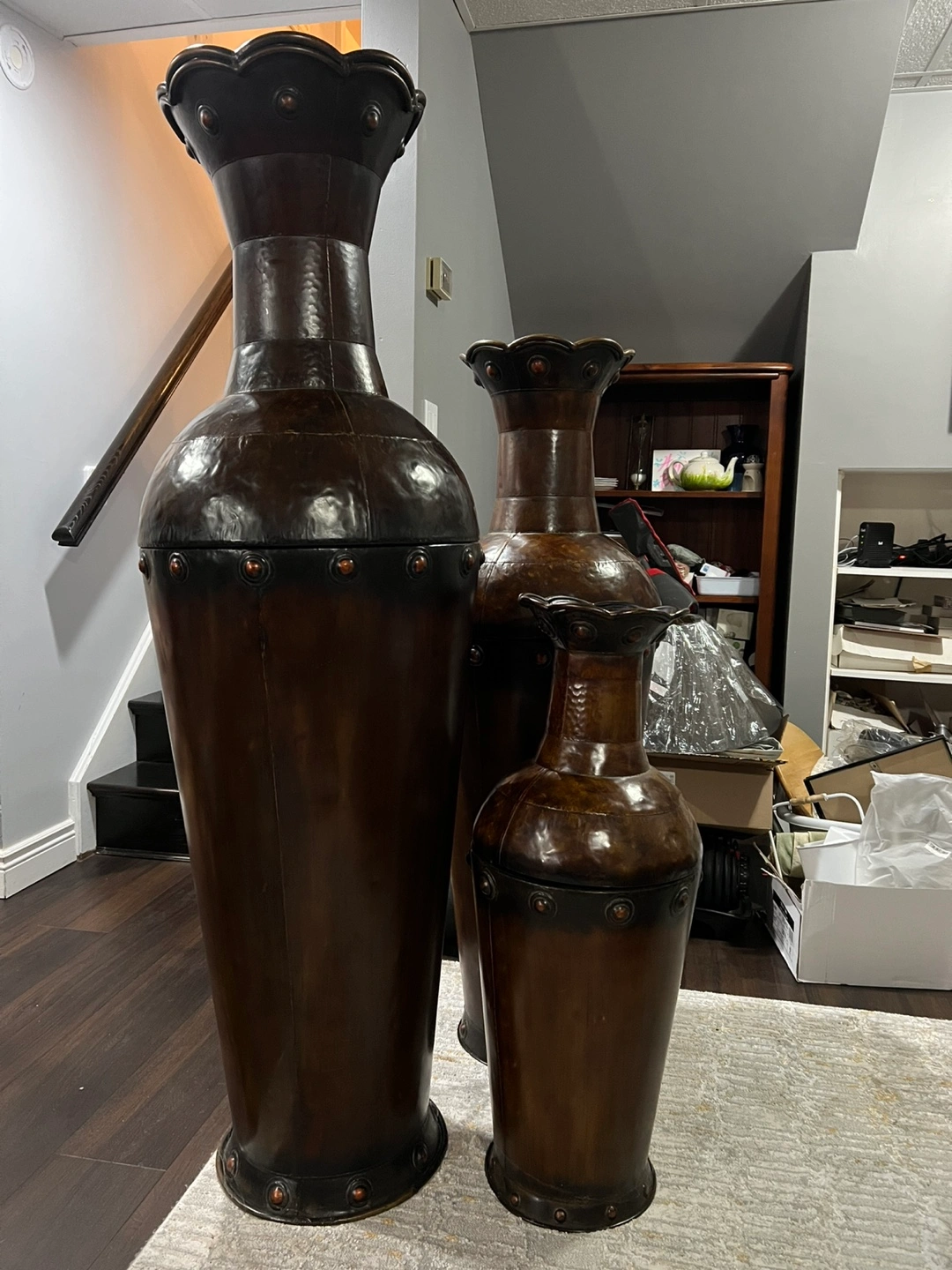 Set of three oversized metal floor vases. Large vase is 5 feet, perfect condition would make wonderful addition to your home decor!!