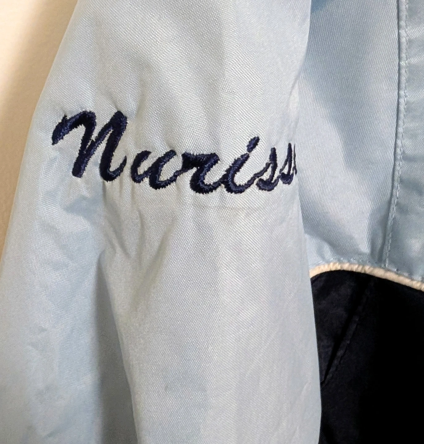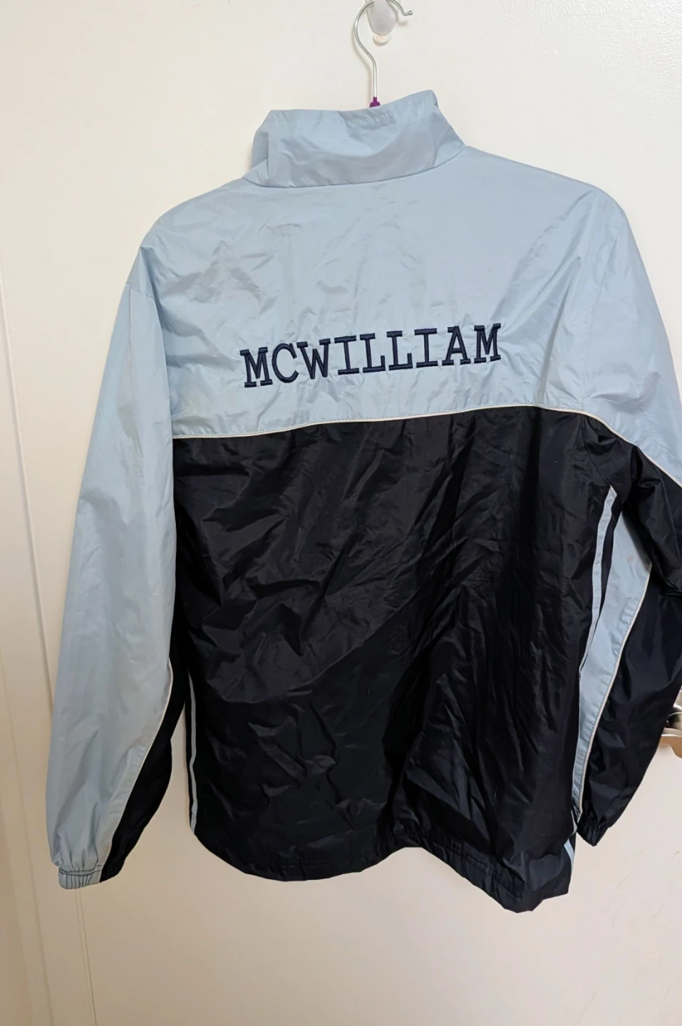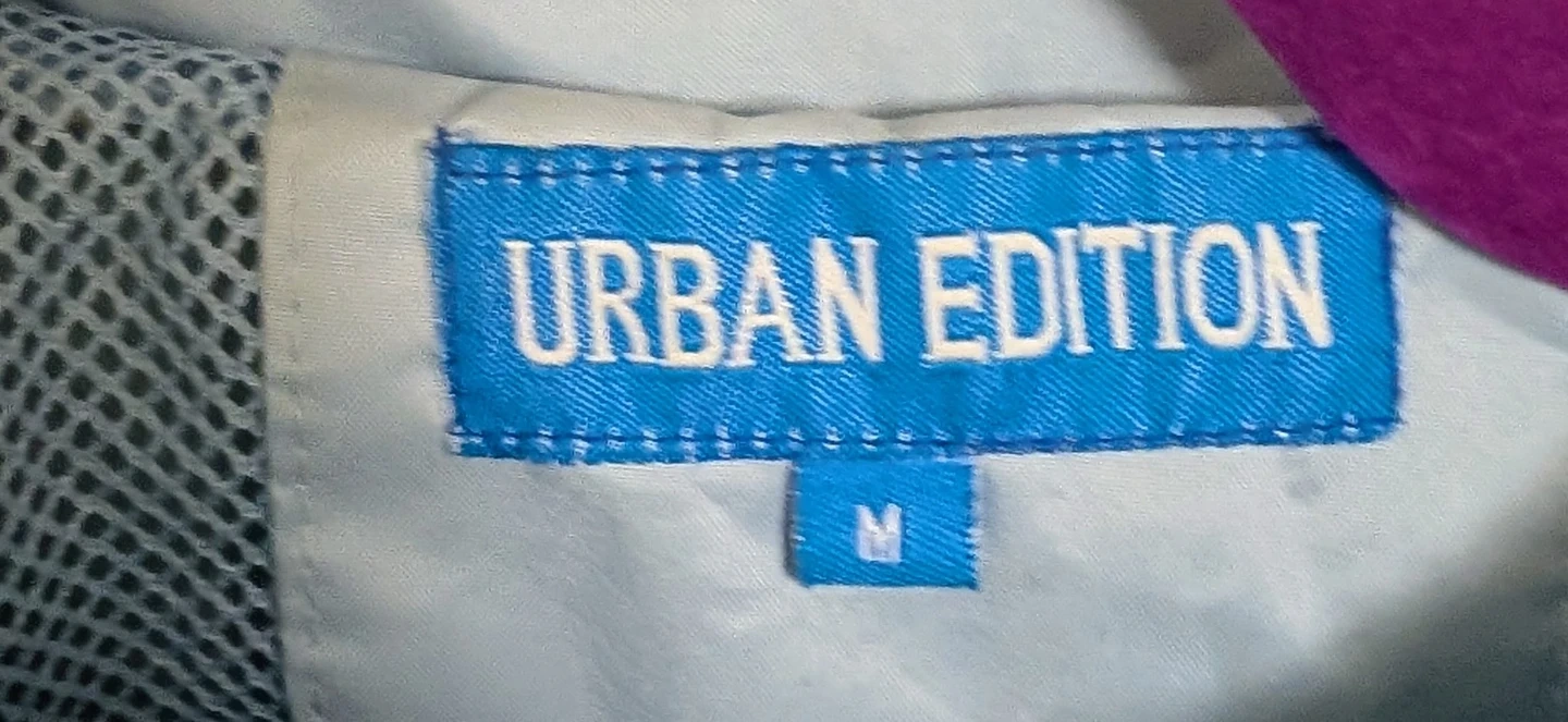 Urban Edition Colour Block Windbreaker Jacket - Women's Size Medium Lightweight windbreaker jacket from Urban Edition. Features a colour block design in blue and black. Includes embroidered name details on the sleeve and back, but hoping someone can remove to reuse.