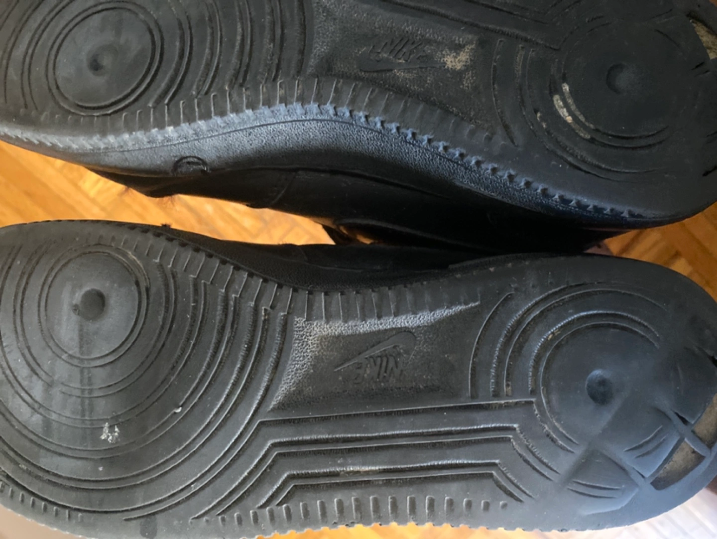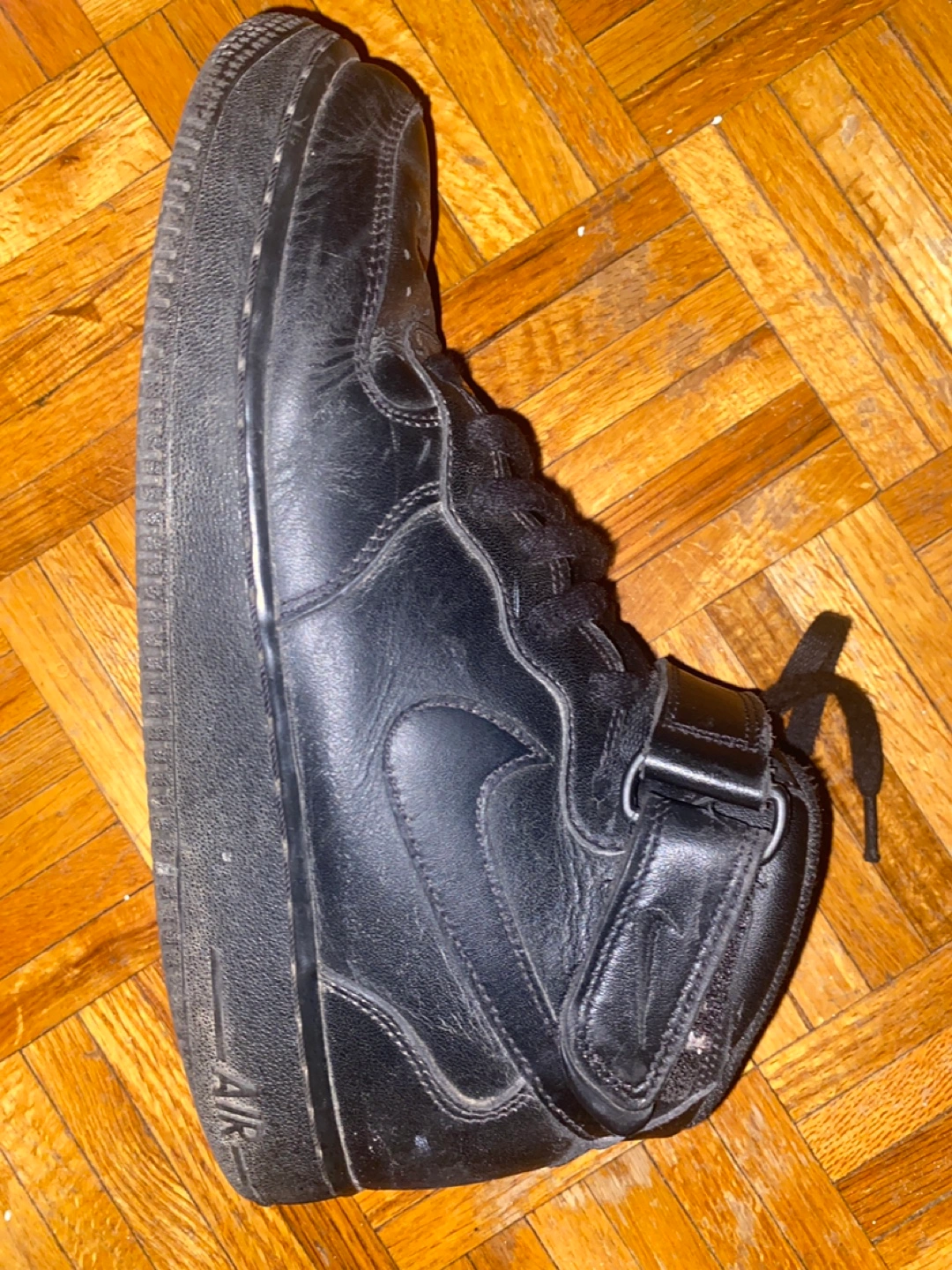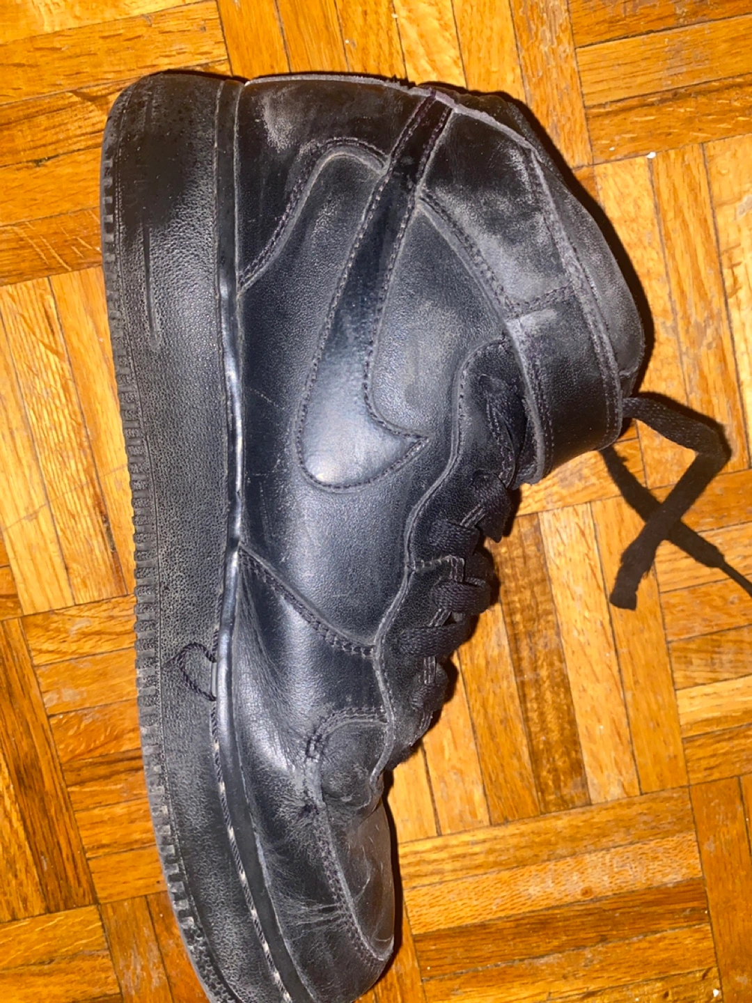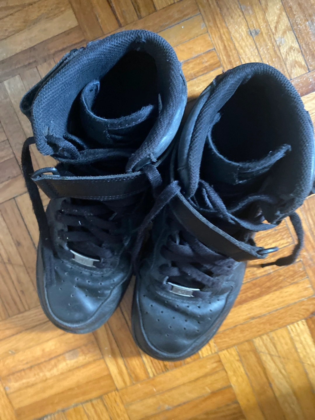 103Black leather high top sneakers with velcro strap. Pretty creased up Can negotiate