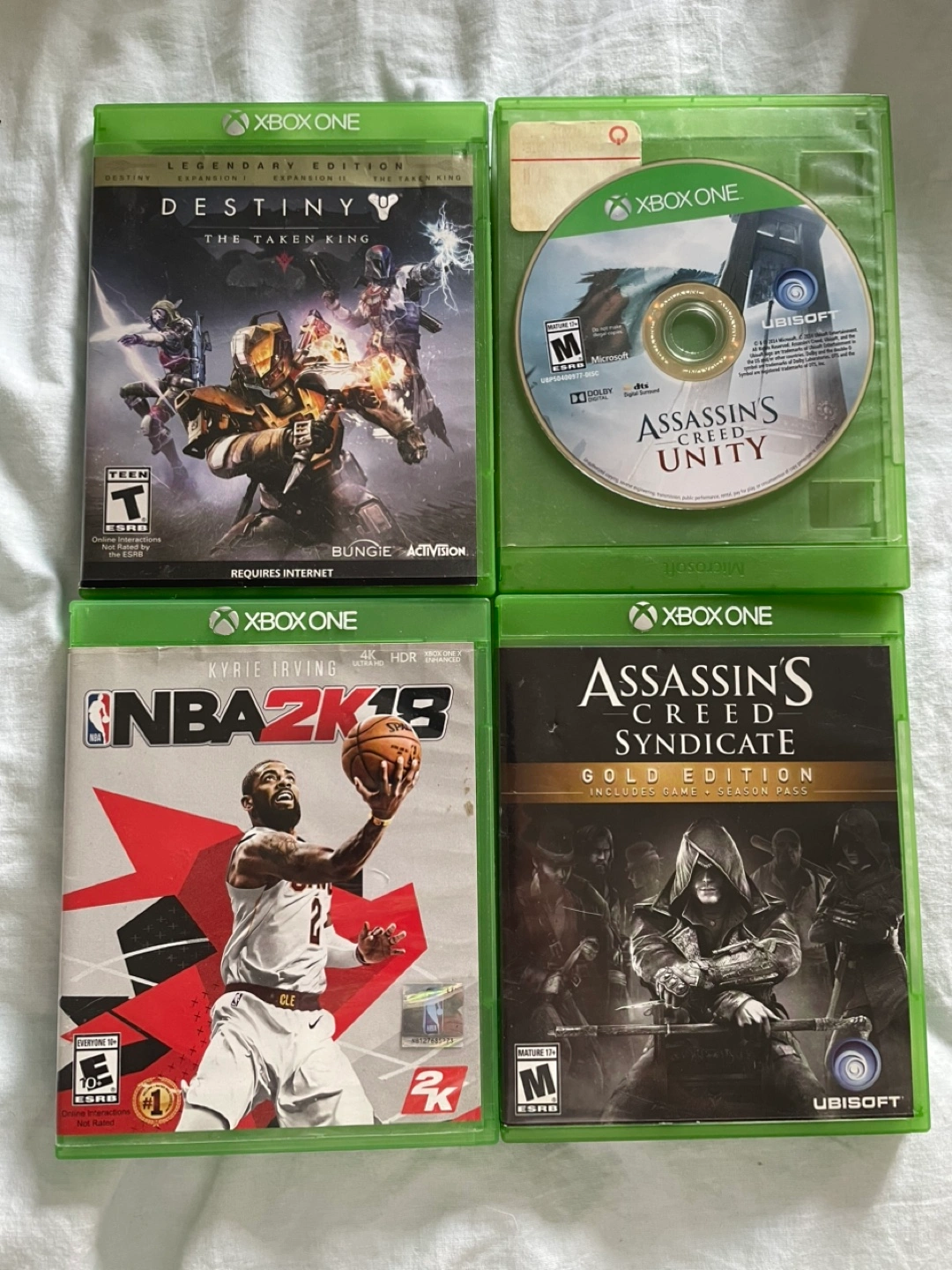 Bundle of 4 usedXbox One games in good condition.Includes Destiny: The Taken King Legendary Edition, NBA 2K18, Assassin's Creed Unity and Assassin's Creed Syndicate Gold Edition.
