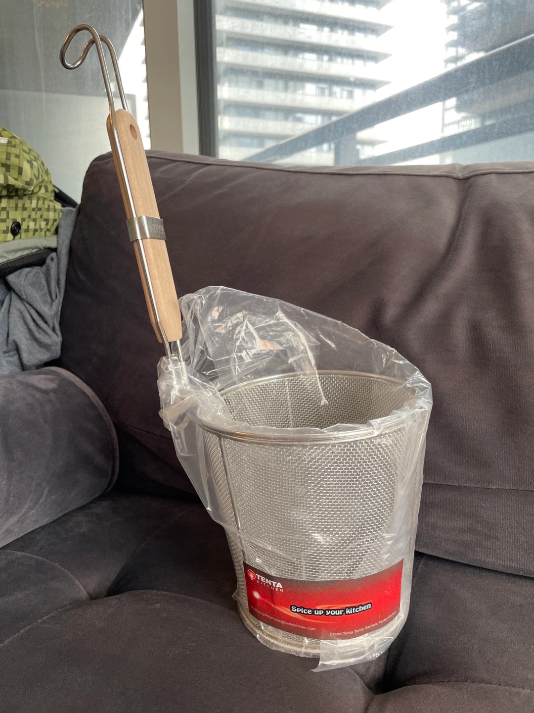 Stainless steel strainer with a wooden handle. Features a hook for hanging storage. Strong and durable.