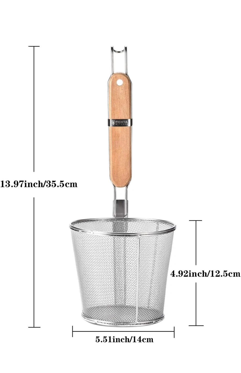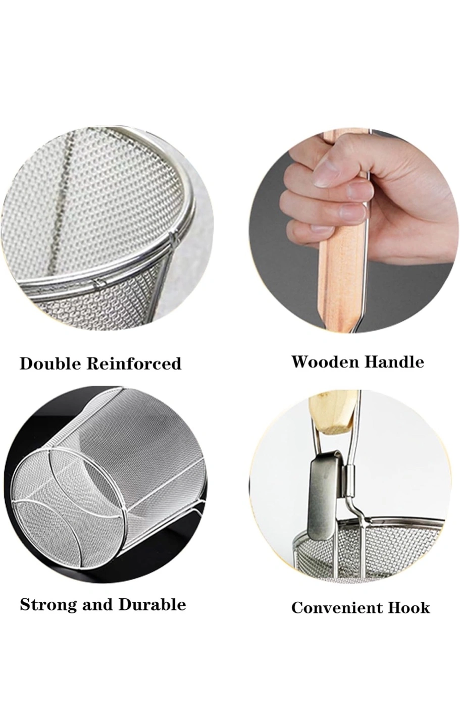 Stainless steel strainer with a wooden handle. Features a hook for hanging storage. Strong and durable.