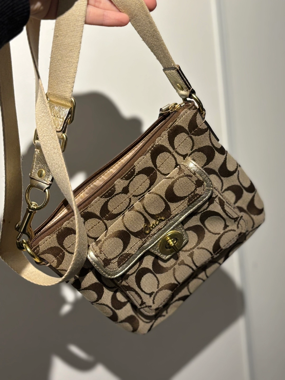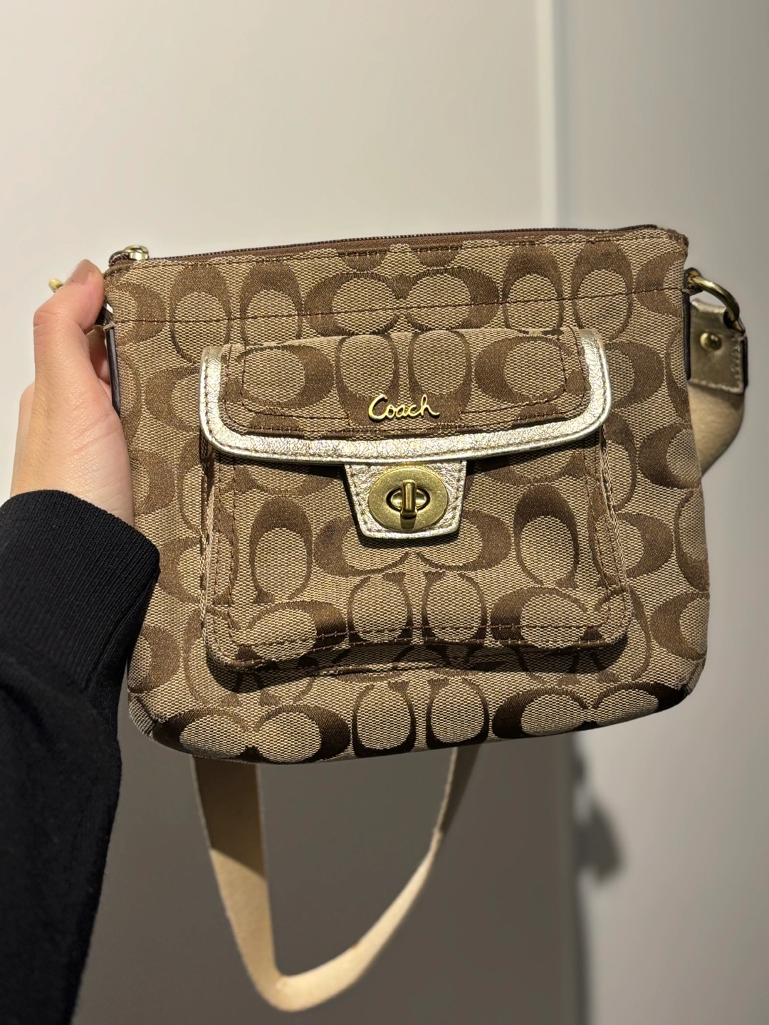 240Small brown and gold crossbody bag. Has a zipper closure and an exterior pocket.
