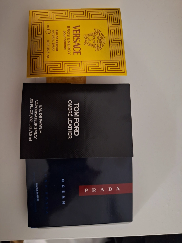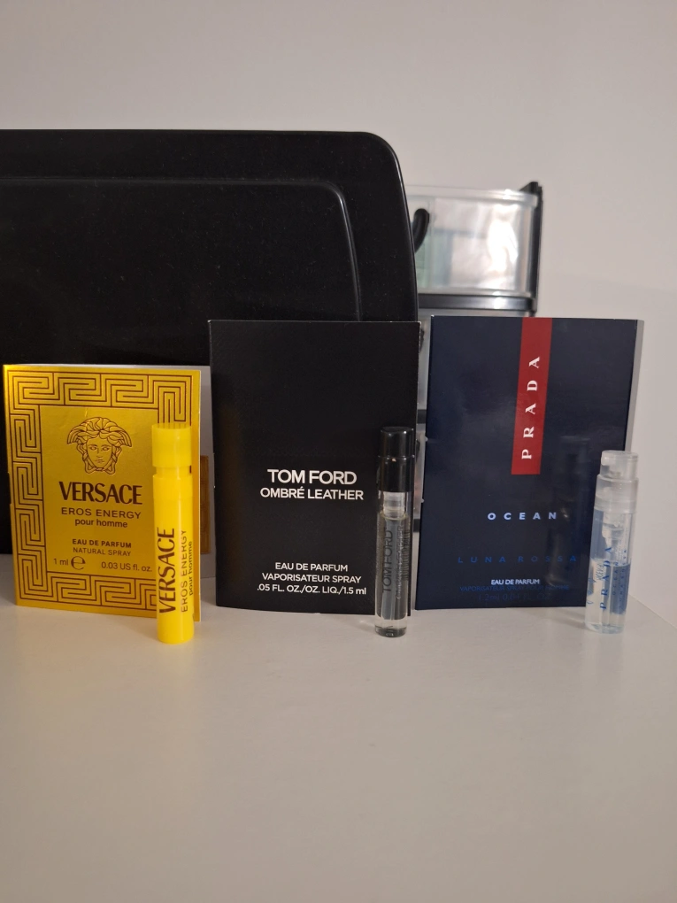 606Three perfume samples. Includes: - Versace Eros Energy - Tom Ford Ombre Leather - Prada Luna Rossa Ocean All samples are 1.5 mL. male parfum.