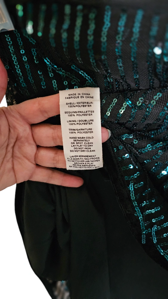 Teal or dark green sequins on long fringes throughout the skirt. When you move, the skirt dances!