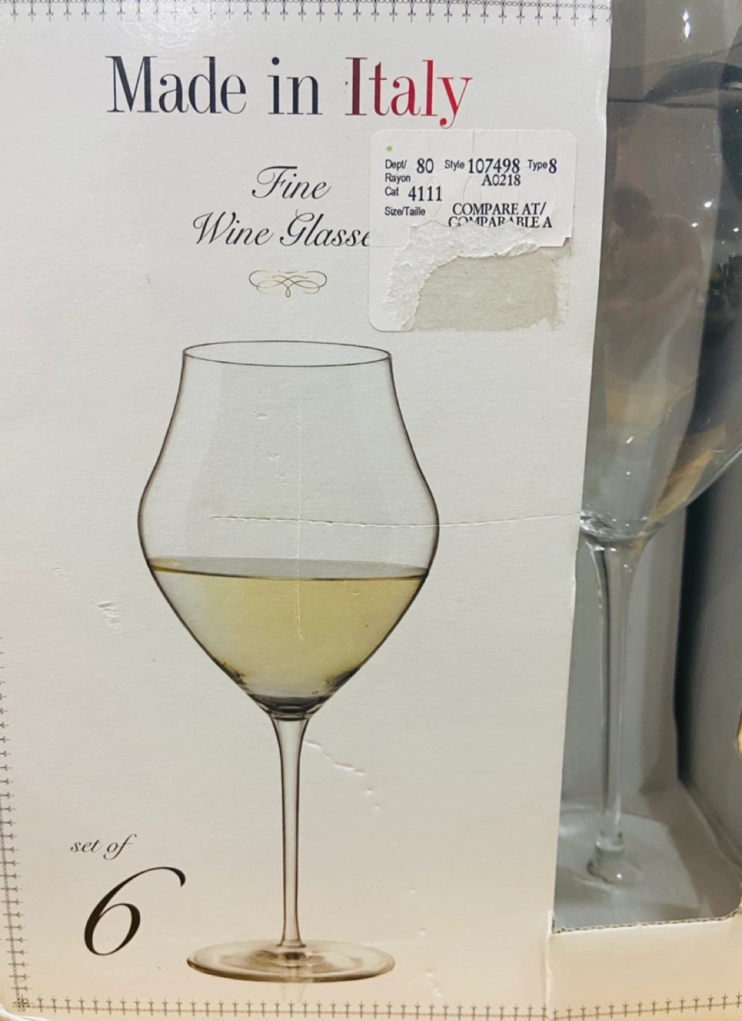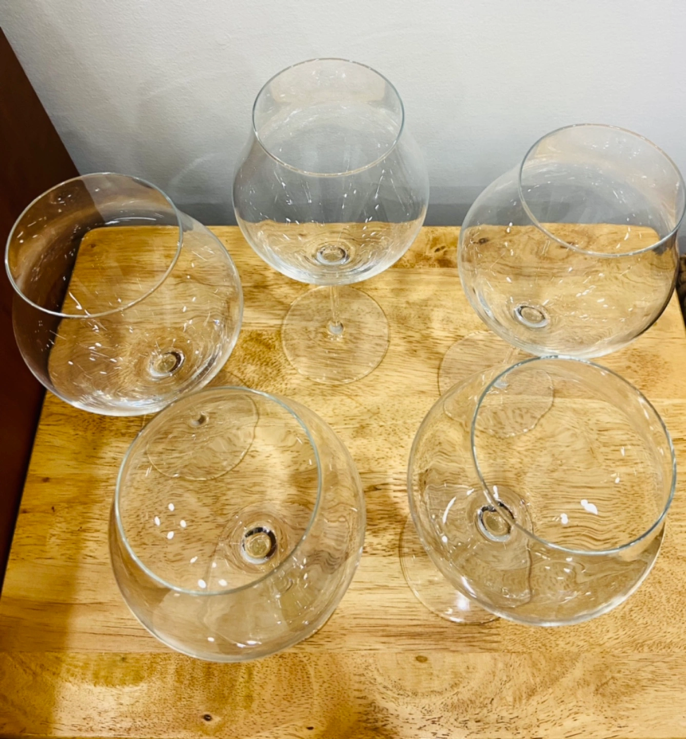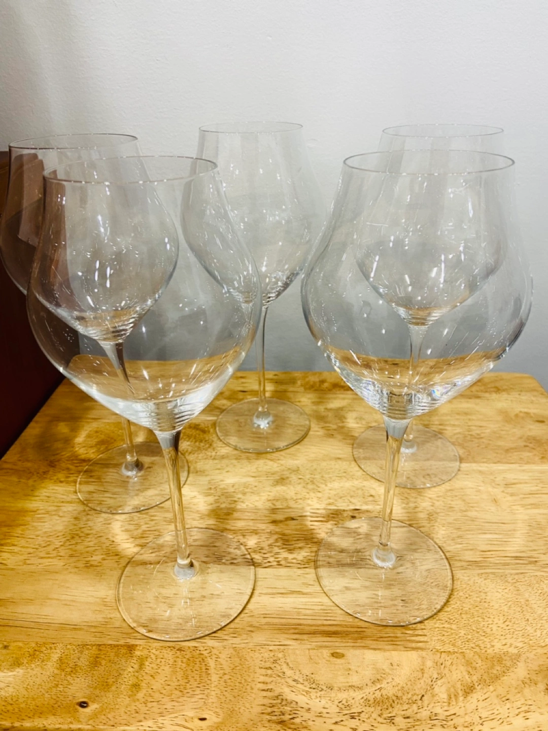Beautiful and elegant set of 5 wine glasses. Made in Italy. Clear glass with tall stems.