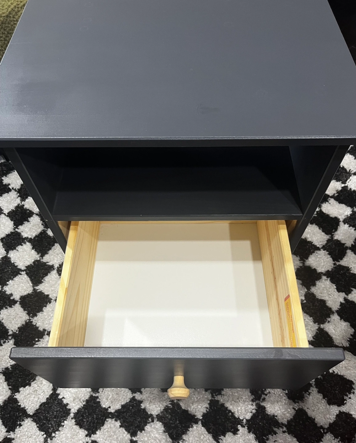 Small nightstand with a drawer and open shelf. Good condition. Solid wood, painted.