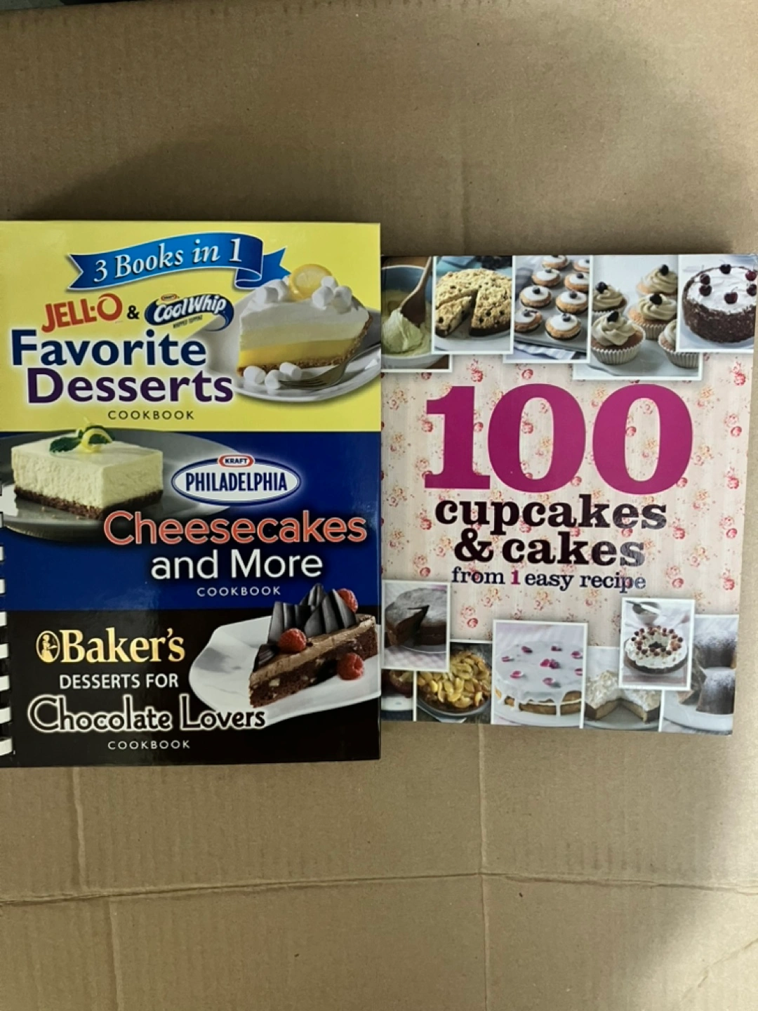 2 cookbooks: Jello & Cool Whip Favorite Desserts, Cheesecakes and More, and Baker's Desserts for Chocolate Lovers. All in good condition.