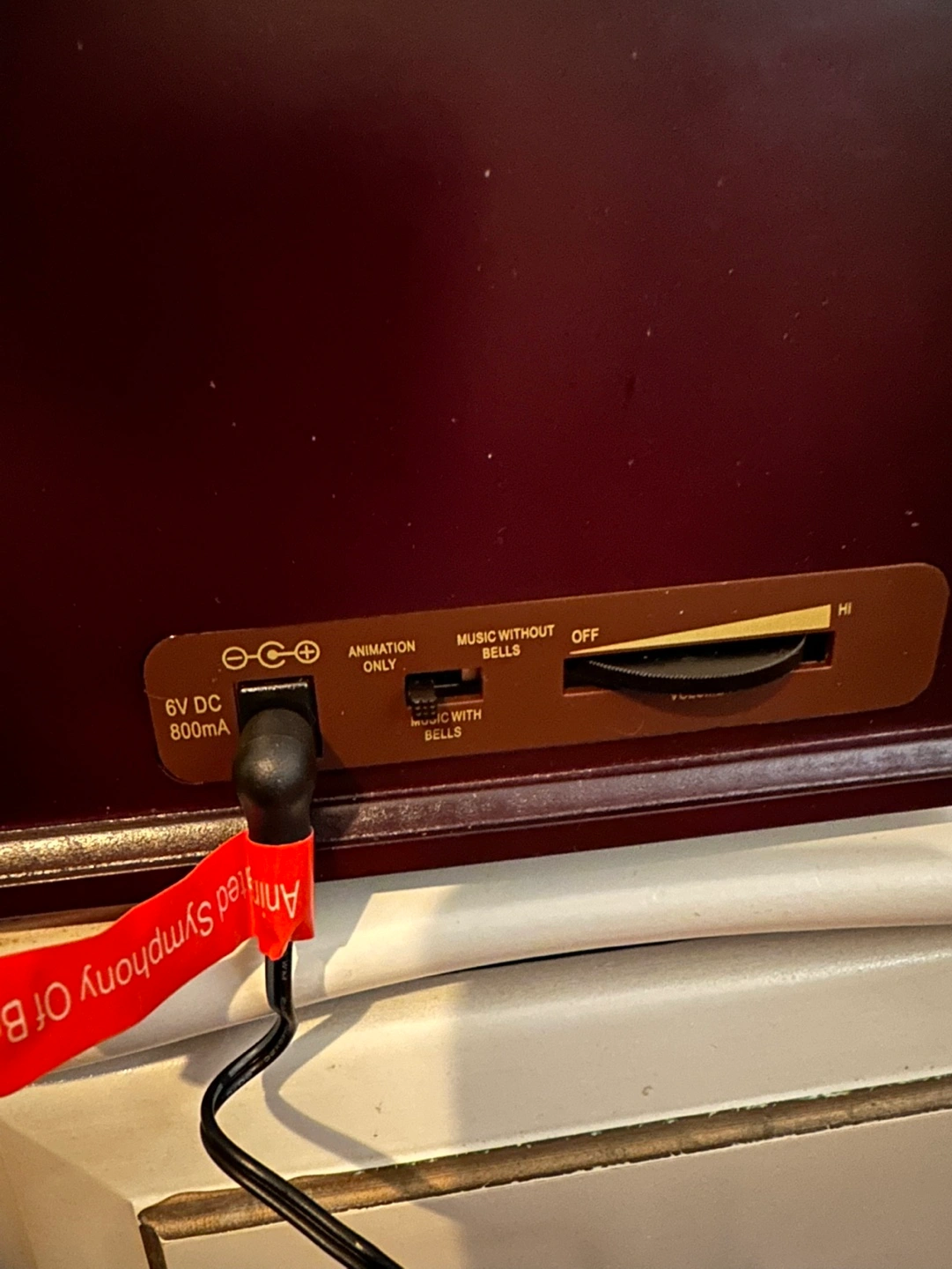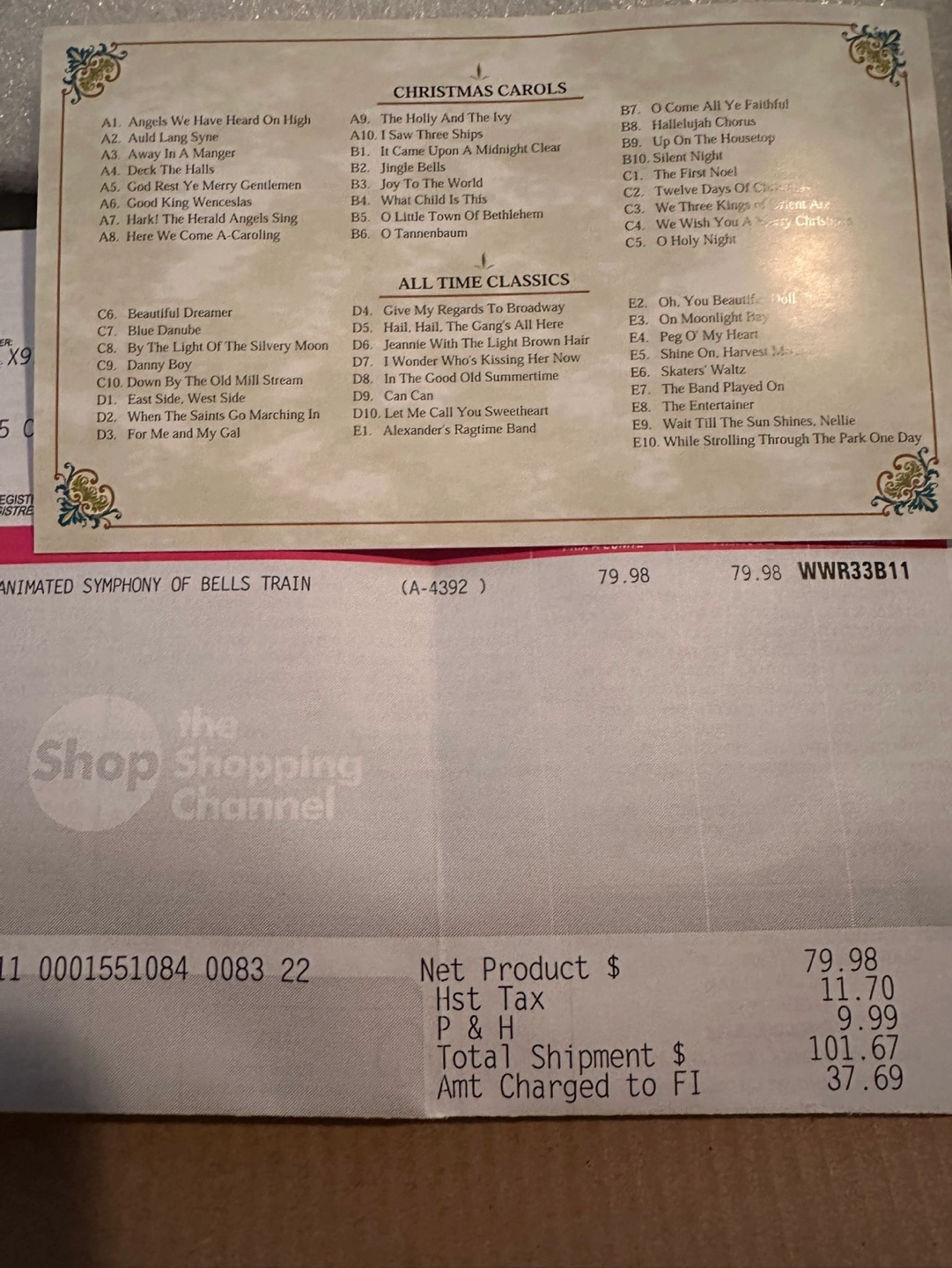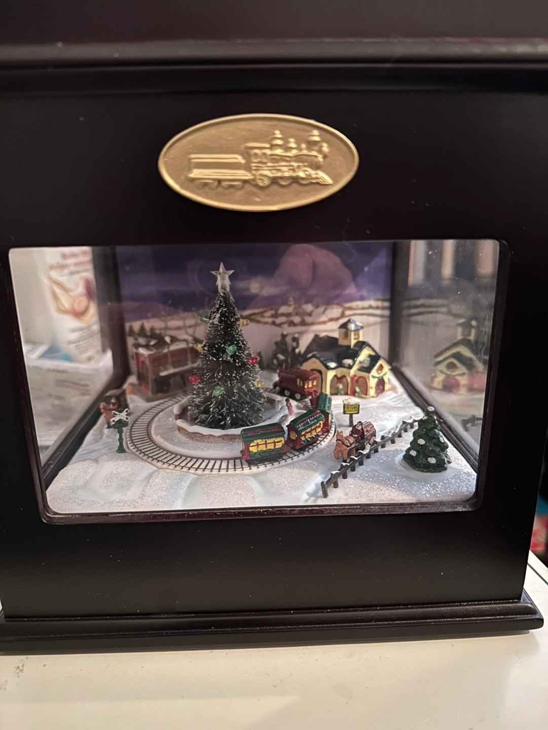 Christmas village with lights, music and a moving train. Includes a Christmas tree, houses and a fence. The train travels around the village. Can be played with/without music and bells. 50 songs available and features select a song technology and volume control. Brand new in box retailed for $100.00 with shipping & taxes. Smoke free home. Original Mr. Christmas brand item.