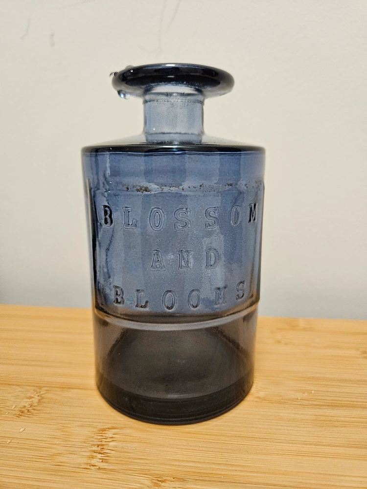 Blue glass vase with a wide mouth. Embossed with the words "Blossom and Blooms".