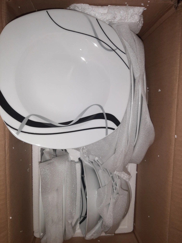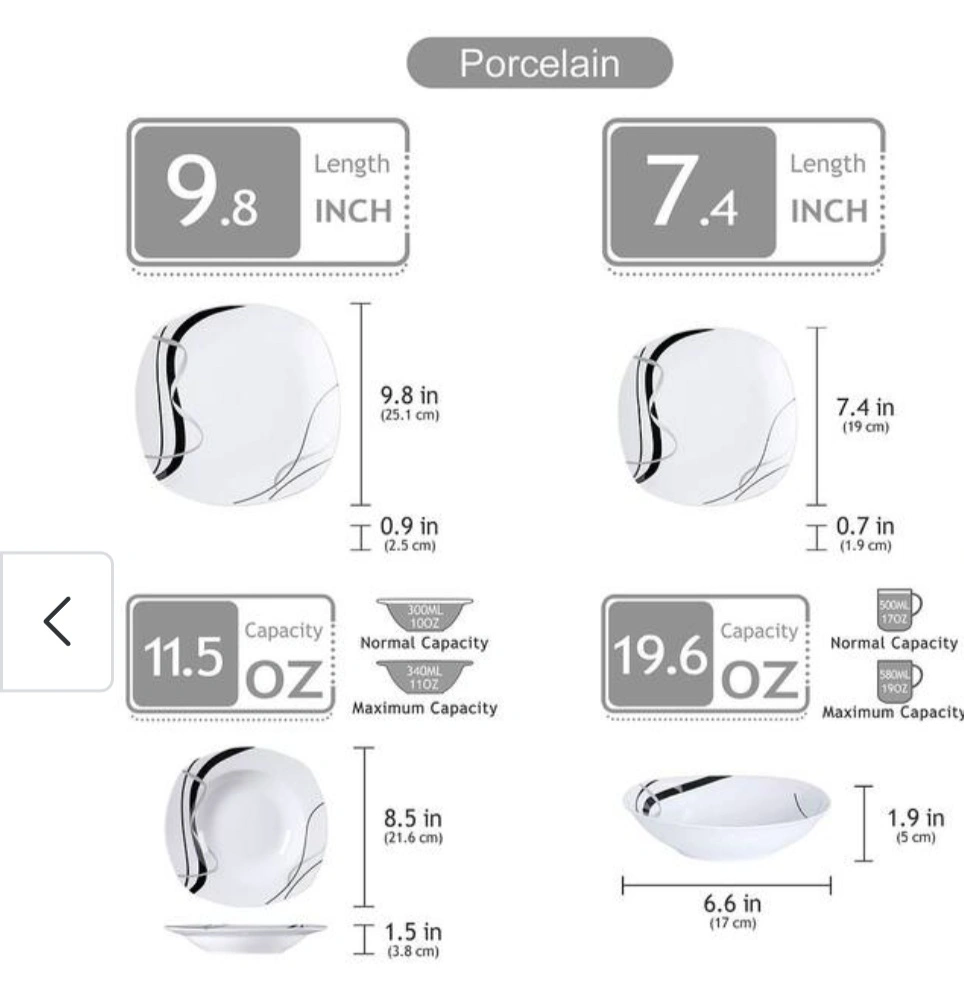 24 piece dinnerware set. Includes dinner plates, salad plates, soup bowl and cereal bowls. Black and grey design.