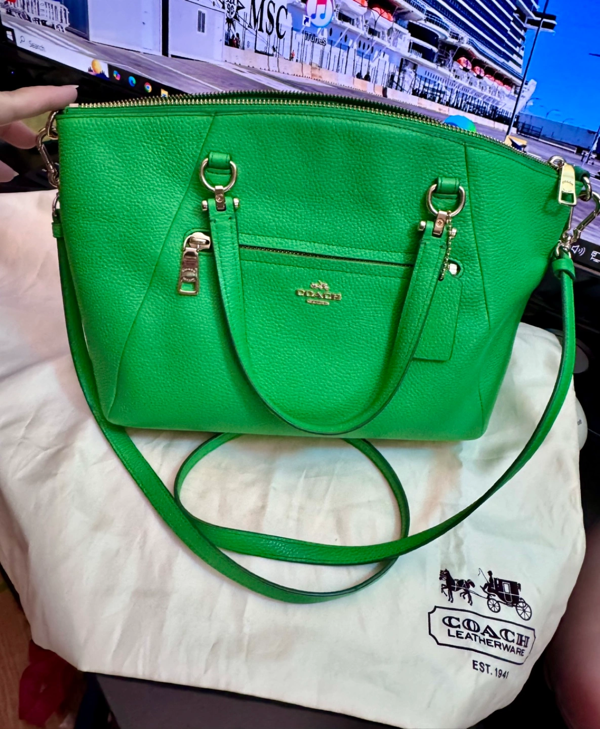 126Green leather handbag with gold hardware. Comes with a dust bag. Gently used, good condition. Final sale.