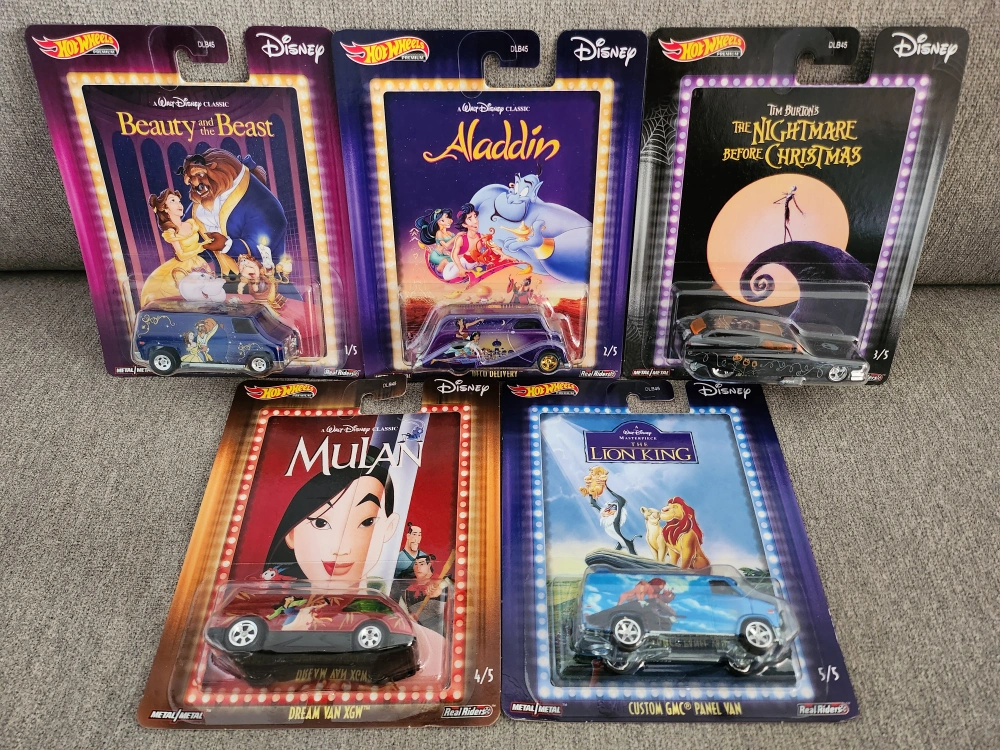 -Set of 5 Hot Wheels Disney Custom GMC Vans. The set features vehicles inspired by Beauty and the Beast, Aladdin, The Nightmare Before Christmas, Mulan, and The Lion King. The vans are unopened and in their original packaging.