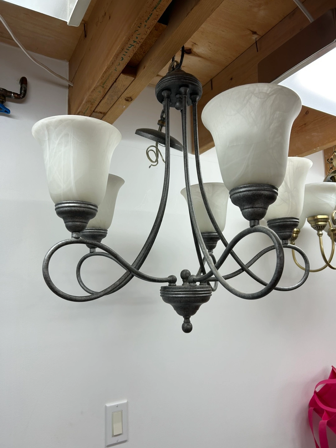 Chandelier with five lights, pewter toned metal frame with white frosted glass shades. Works great