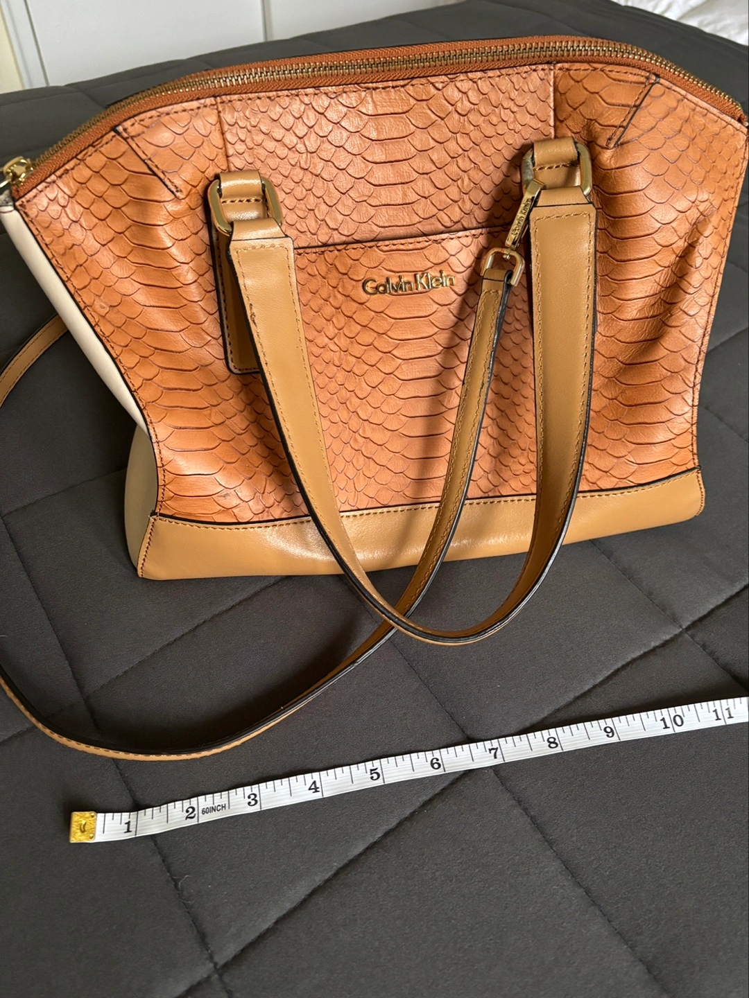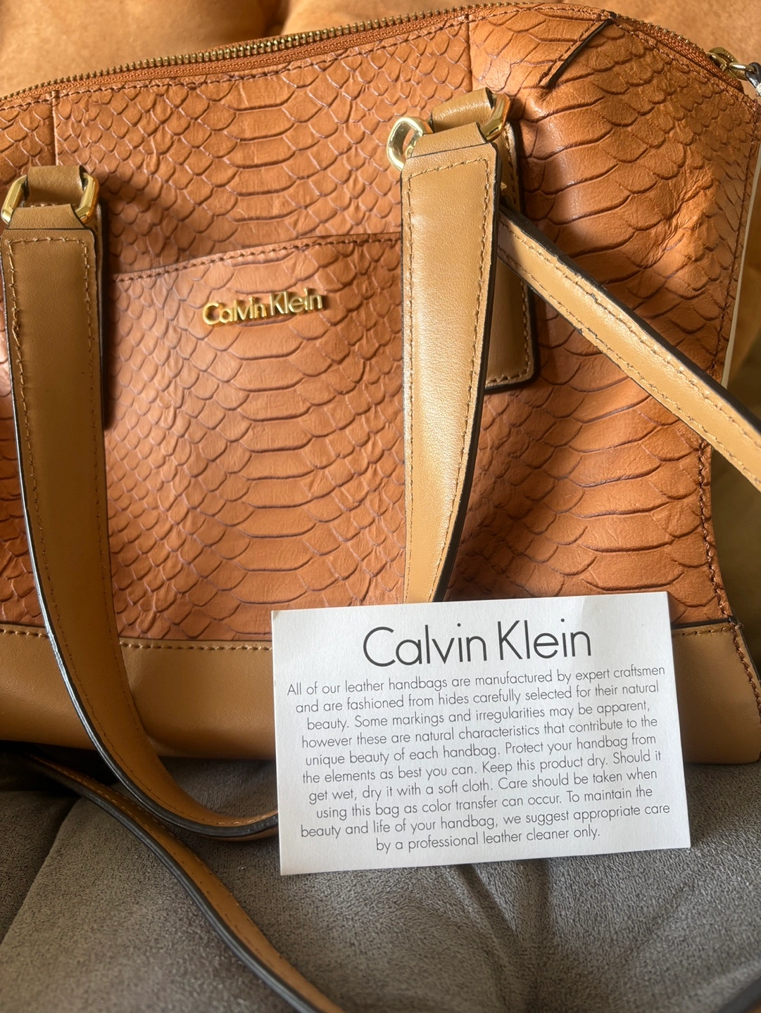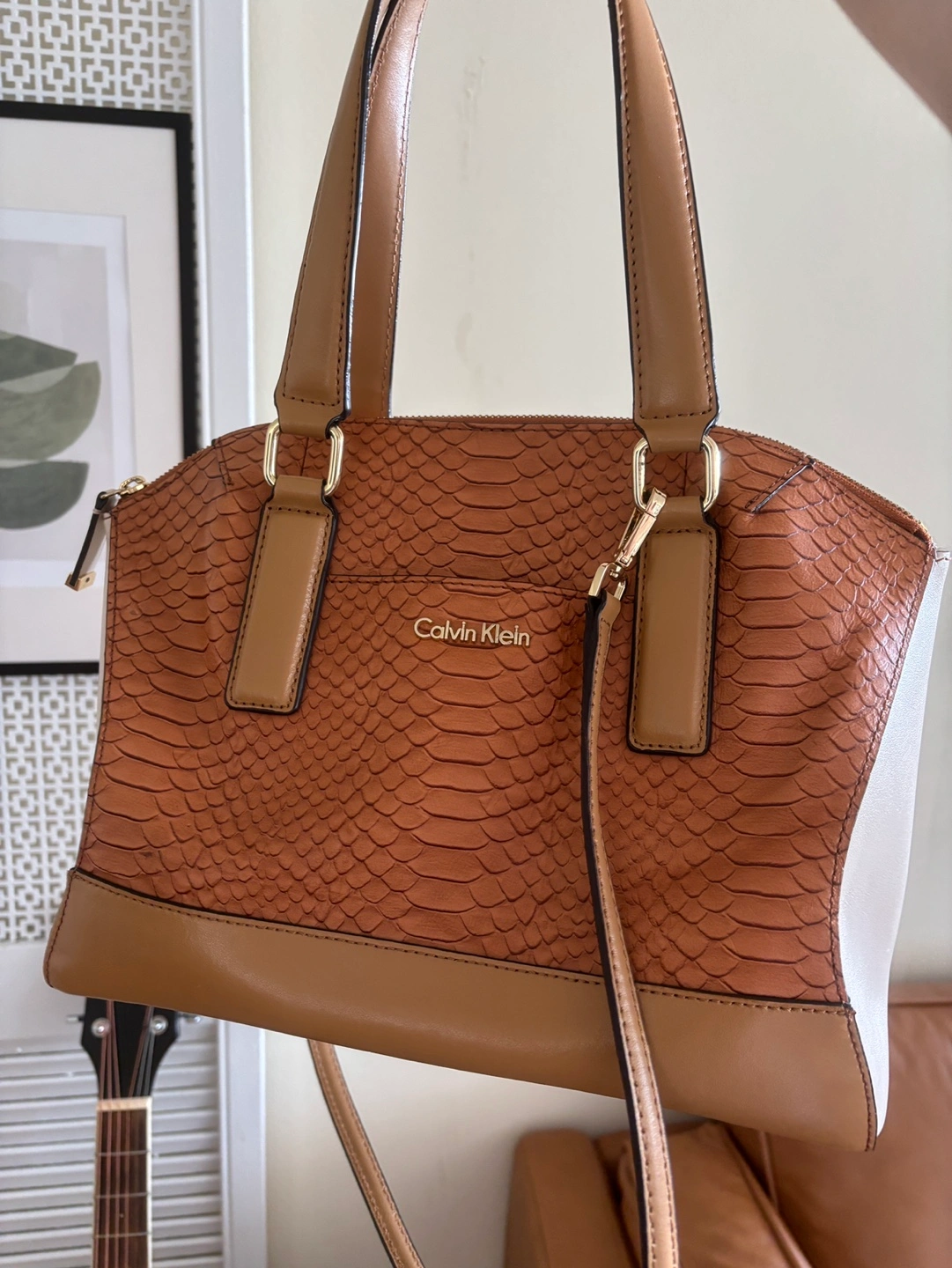 153Authentic CK, medium-sized handbag with certificate. Bought at the Bay in 2014. Tan and cream snake skin pattern. It has a top zipper closure, gold hardware and comes with a detachable shoulder strap. Cash only. Pick up at RBC Bathurst and Sheppard. #CK #calvinklein #handbag #purse