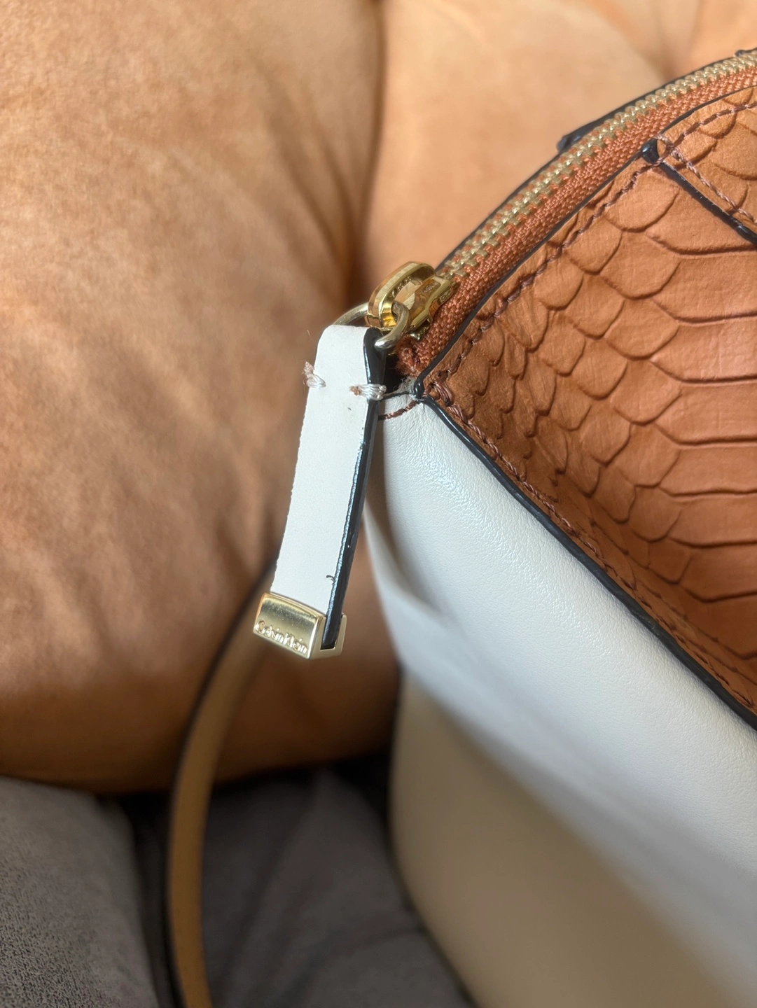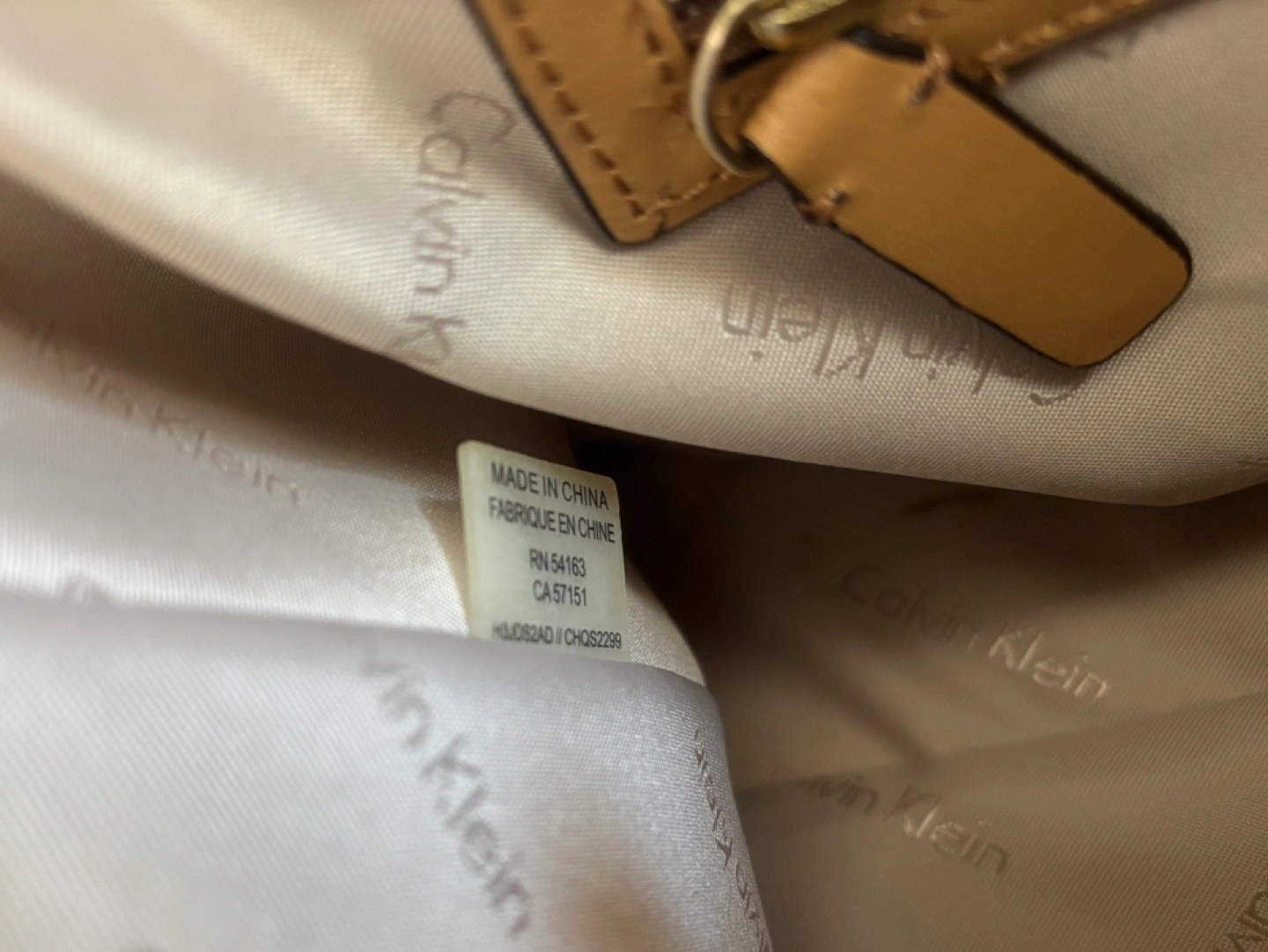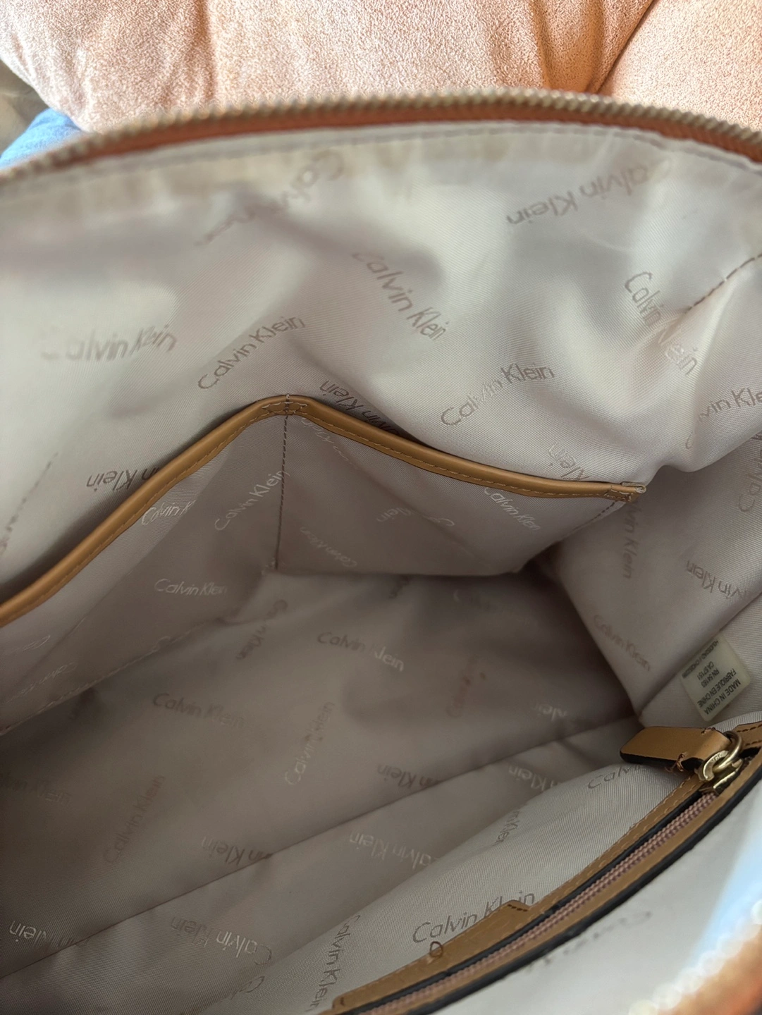 153Authentic CK, medium-sized handbag with certificate. Bought at the Bay in 2014. Tan and cream snake skin pattern. It has a top zipper closure, gold hardware and comes with a detachable shoulder strap. Cash only. Pick up at RBC Bathurst and Sheppard. #CK #calvinklein #handbag #purse