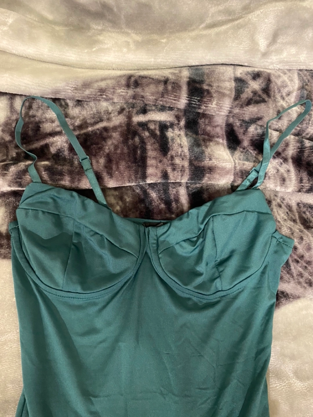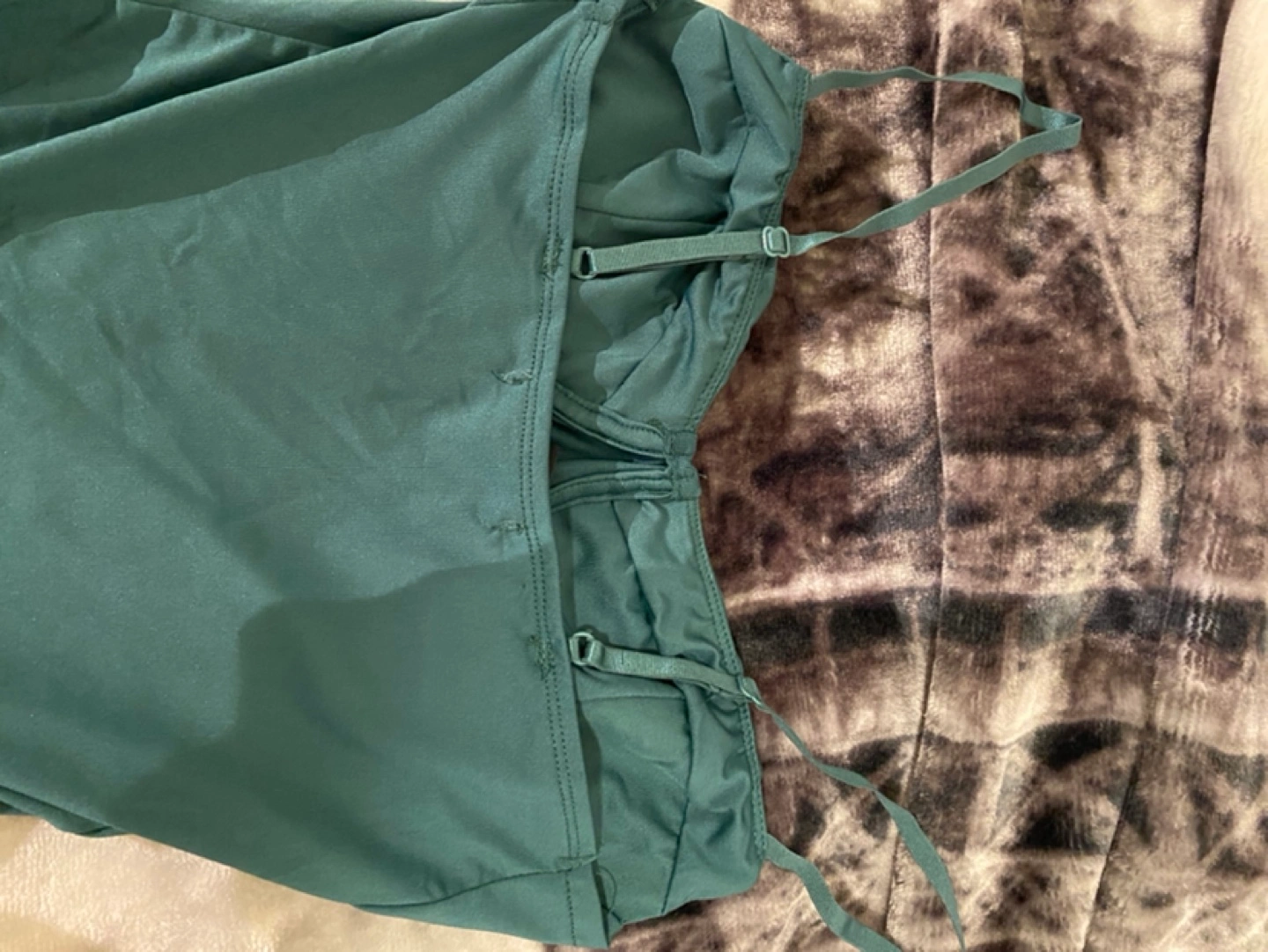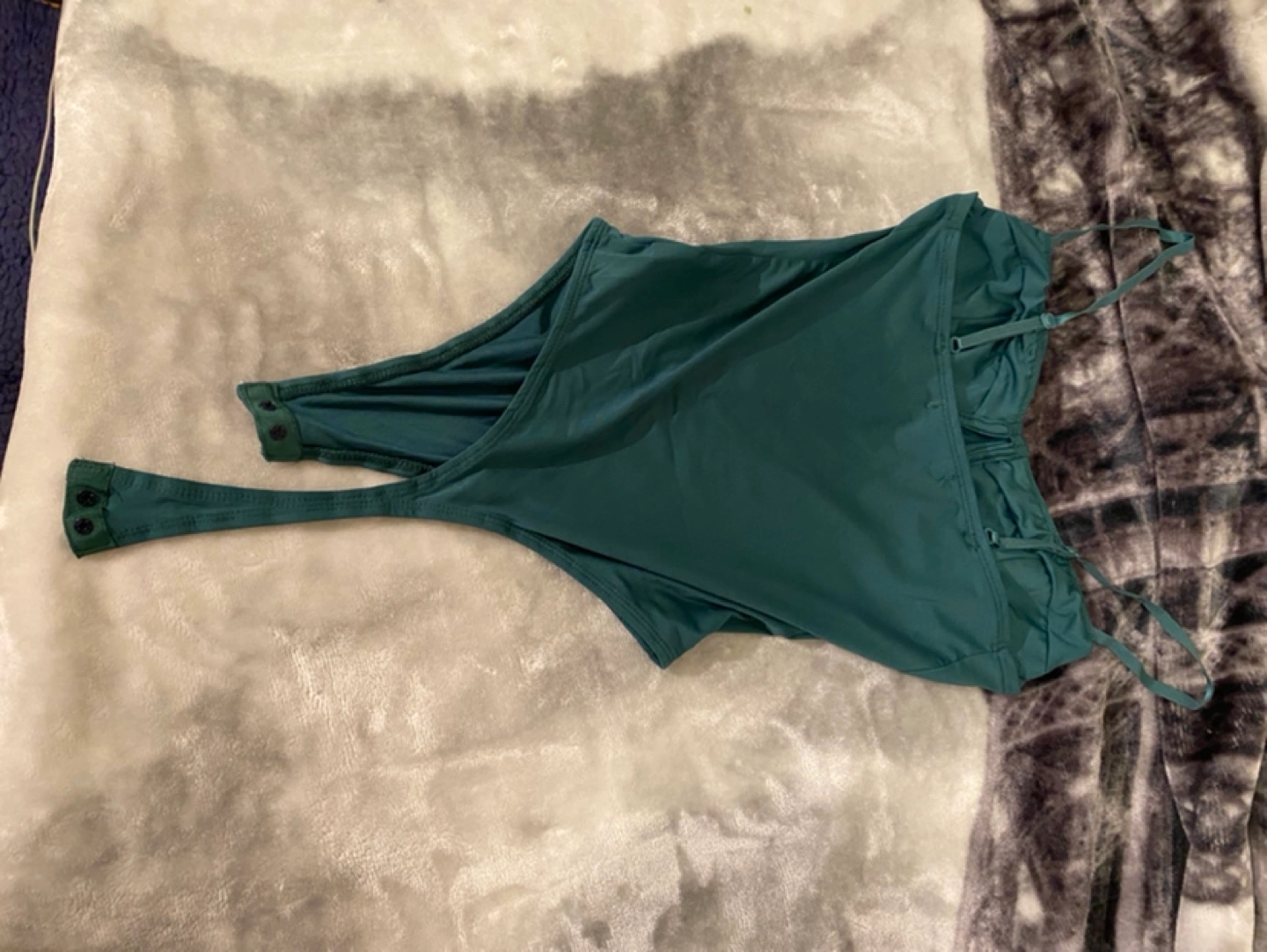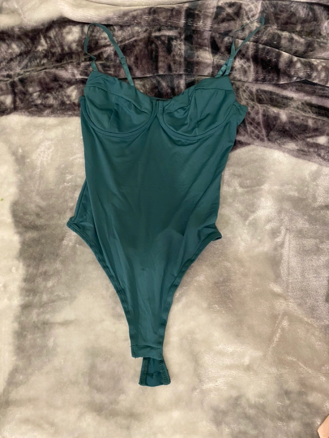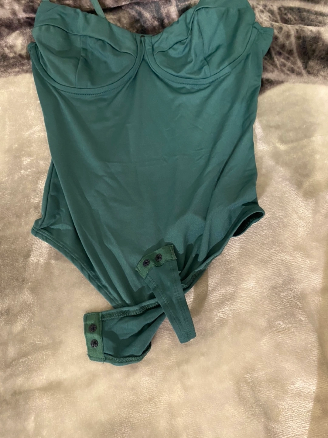 Green bodysuit with adjustable straps. Snaps at the bottom. Never worn
