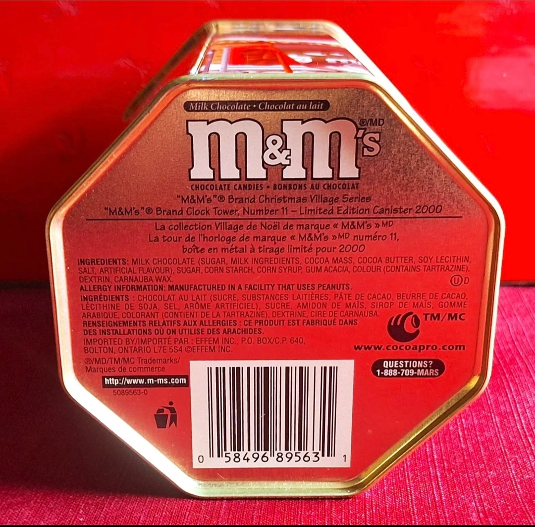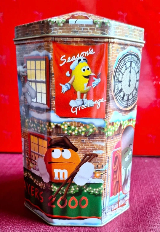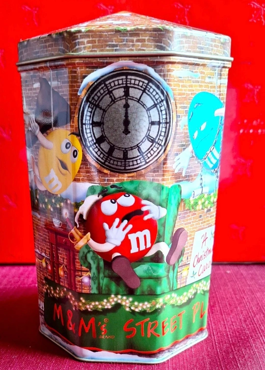 M&M's Christmas Village Series Clock Tower #11 Canister Street Players L/E 2000. Octagonal tin featuring M&M's characters. The Tin is 7" in height. Like New, never used.