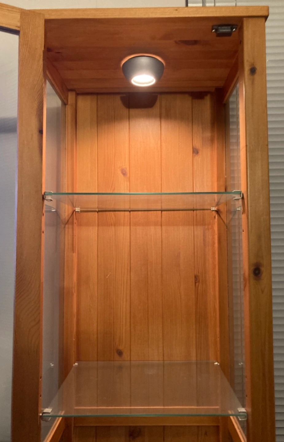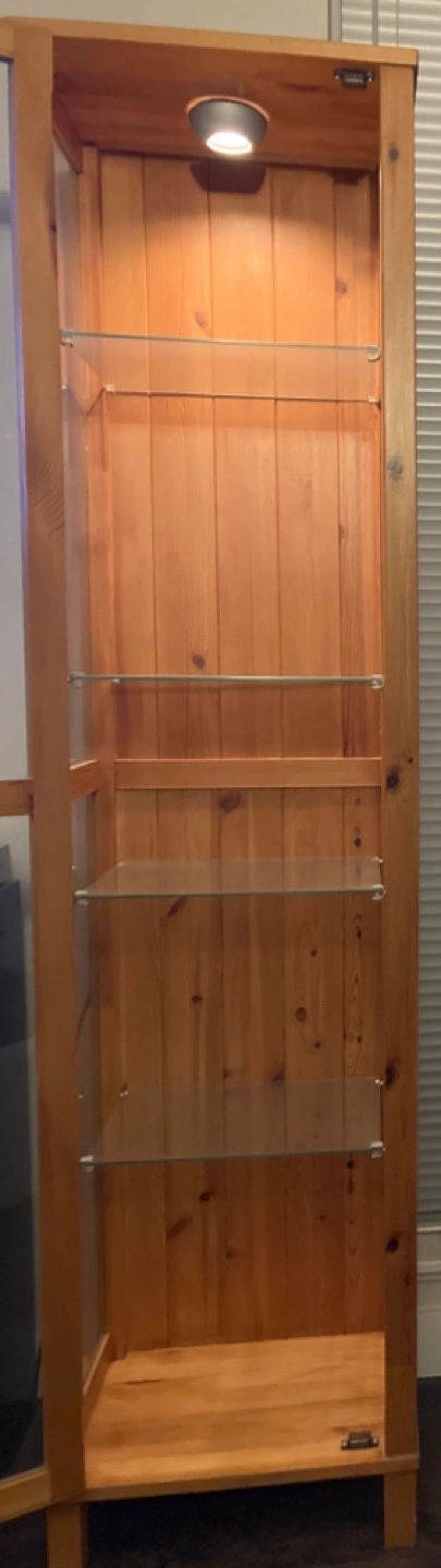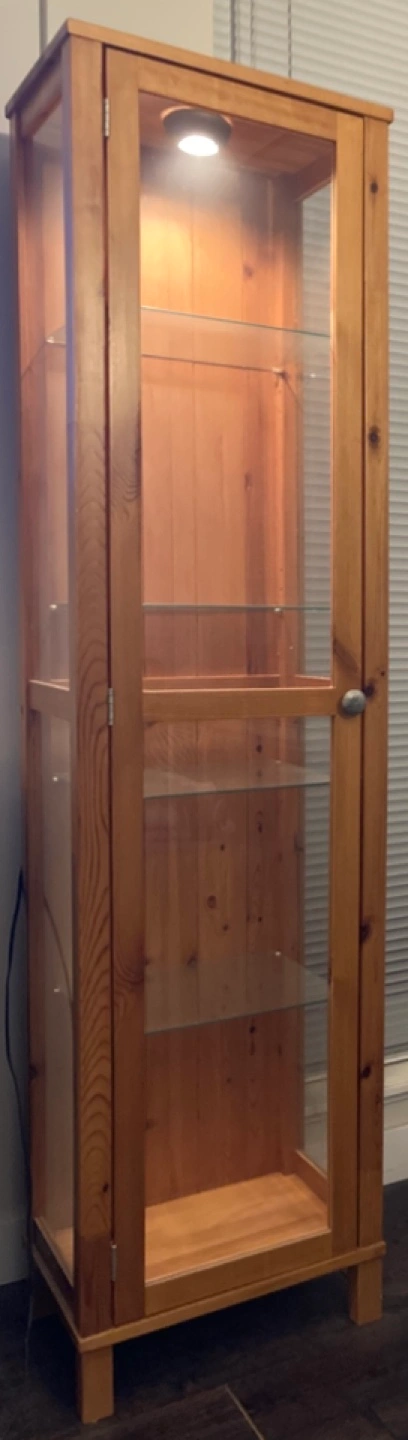 Tall wooden cabinet with glass doors and shelves. Includes a light inside.