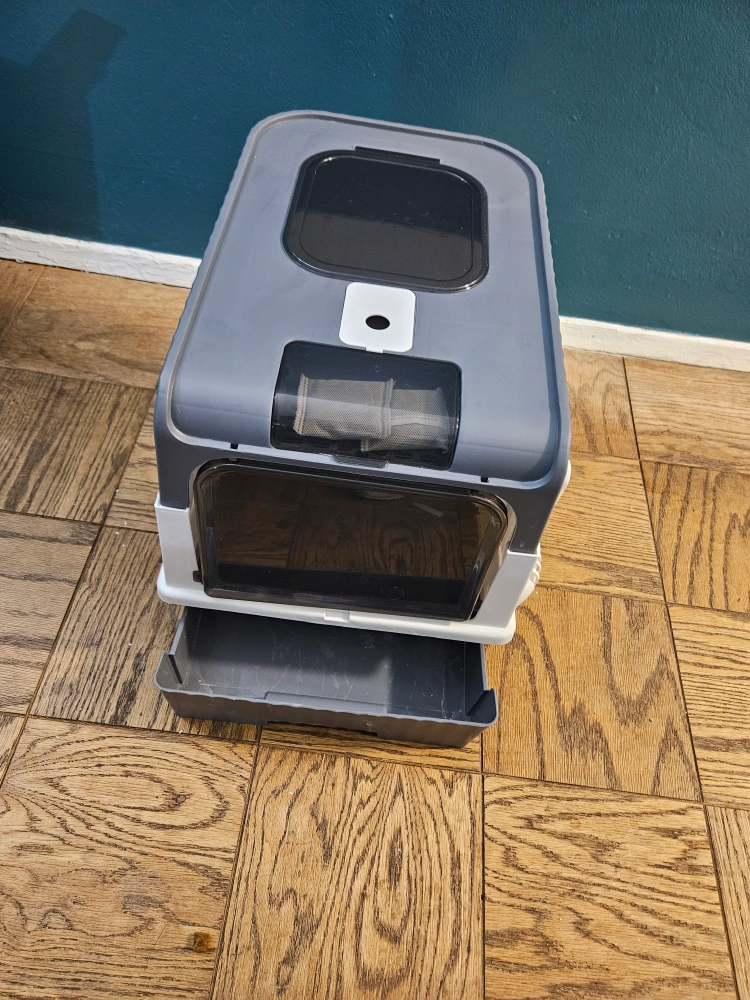 Cat litter box . Gray and white color. Includes a scoop and a drawer for easy cleaning. 2 entrances, on top and front. Best for average size cats, less than 15 lbs. Used once