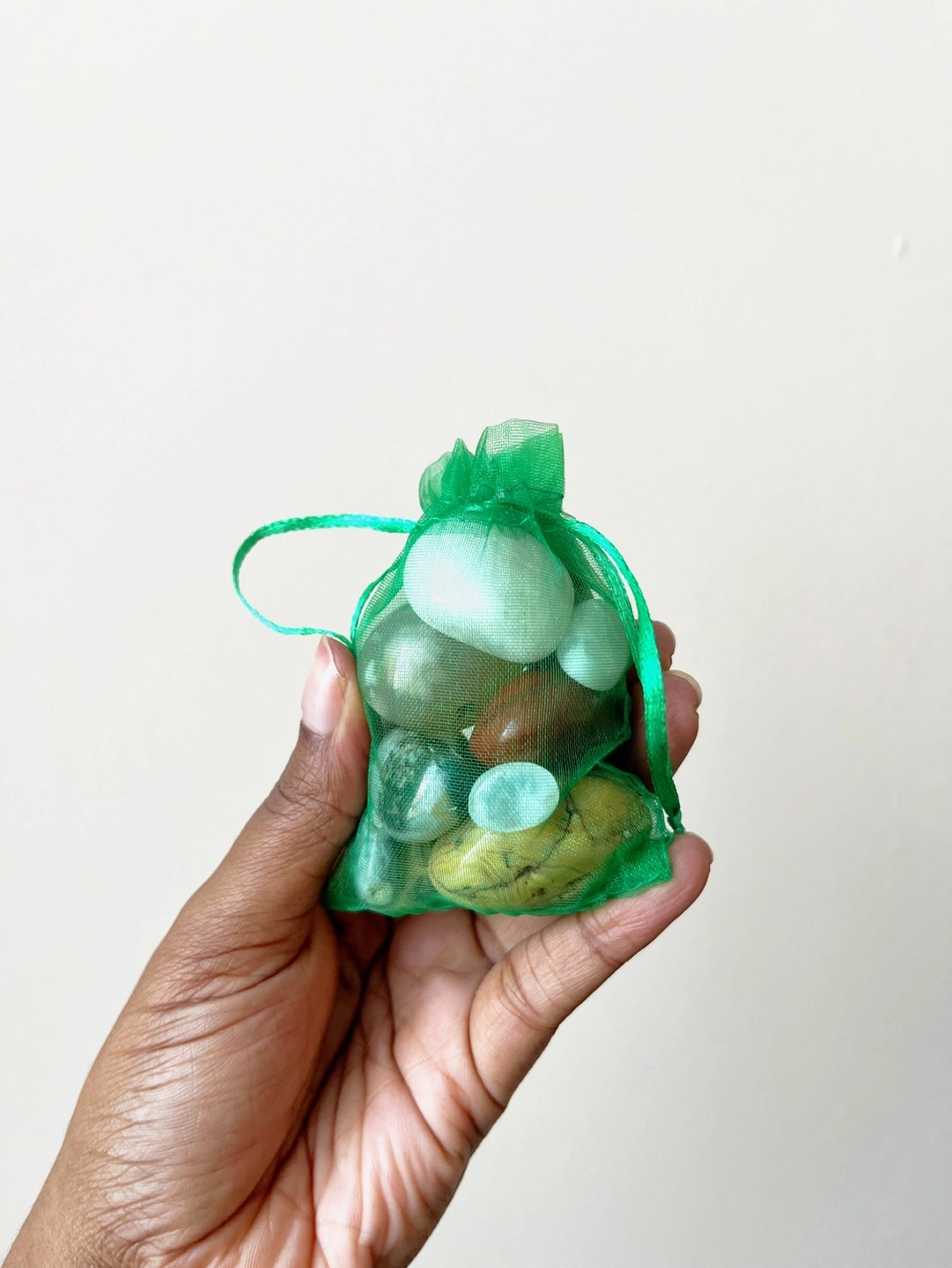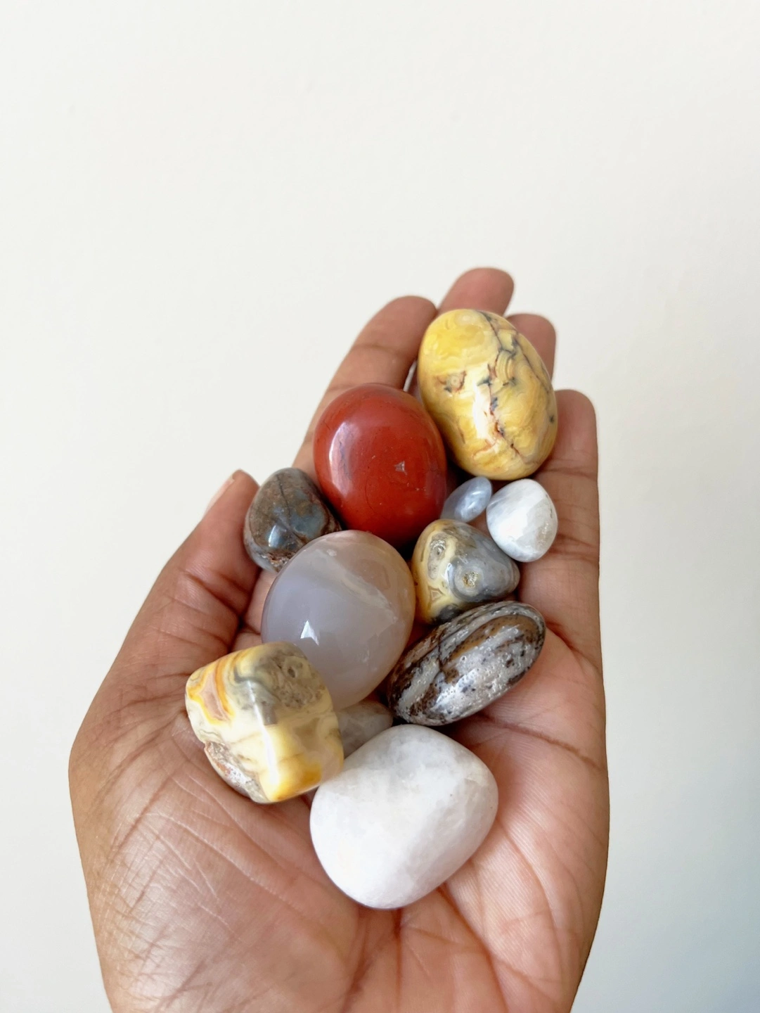 Set of assorted crystal tumbles (quartz, red jasper, zebra jasper, yellow jasper, etc❤️💛) Perfect for crystal healing, meditation or for a gift. Comes in a green organza bag.