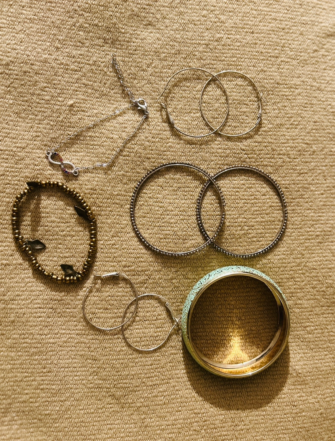 1000+Set of 6 assorted bracelets and bangles. Includes a silver infinity chain, a beaded bracelet, two silver bangles, and two silver hoop earrings.