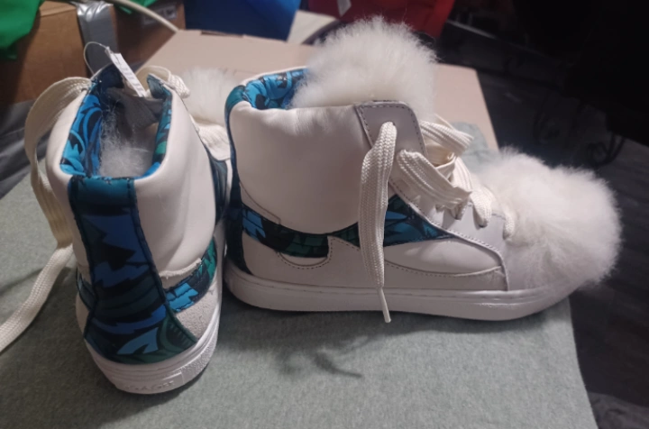 152 pairs. Price is per pair. White leather high top sneakers with blue patterned accents. Fur pom pom on top of each shoe.