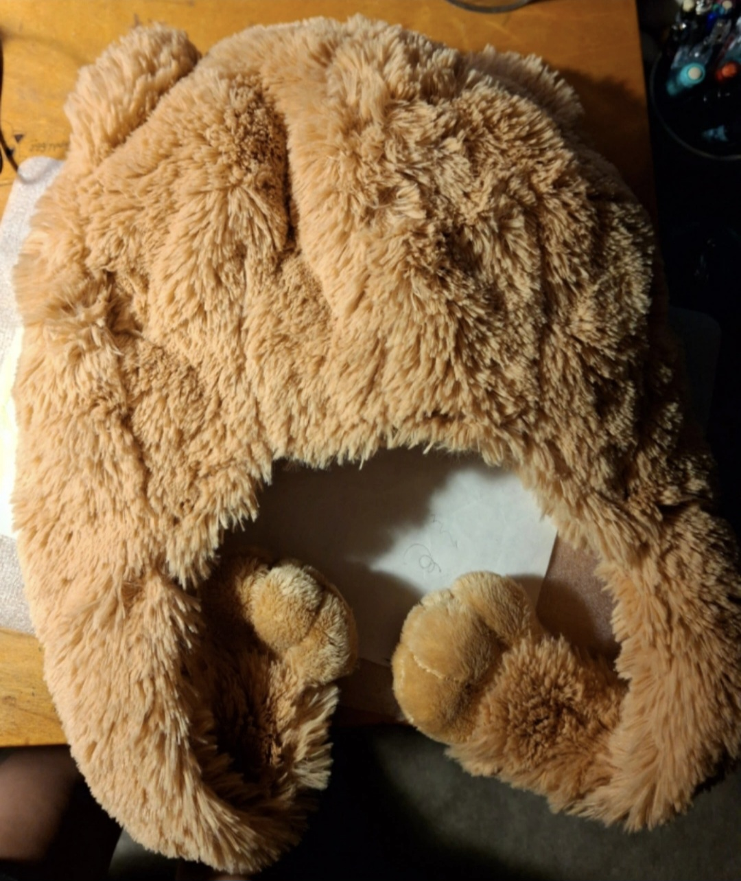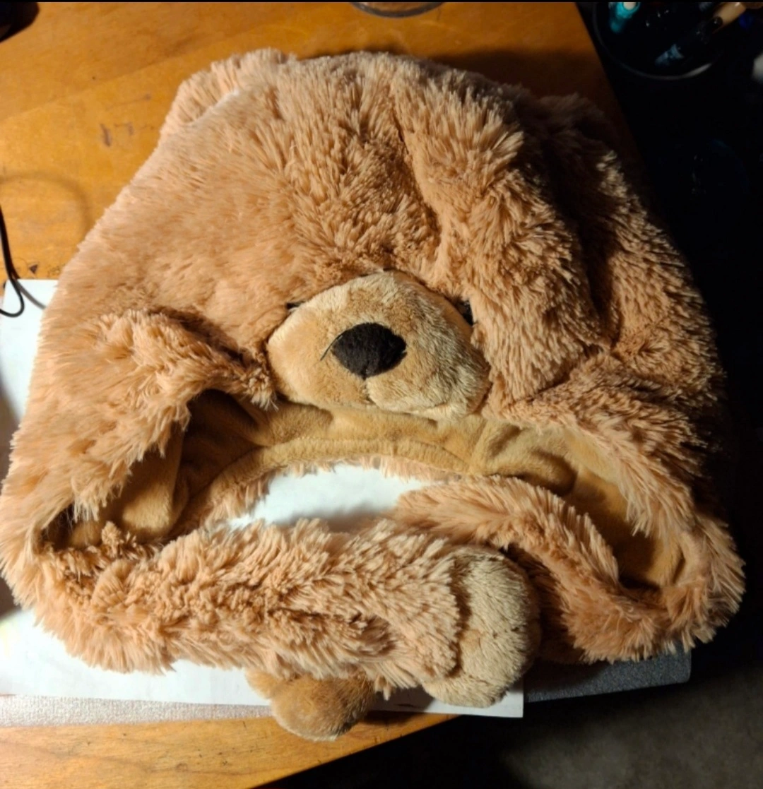 Brown bear-shaped hood/hat made of soft, plush fabric (like an actual teddy bear) that has hanging paws to cover your ears. Great for staying warm and cozy on a cold day. Fits adults and kids.