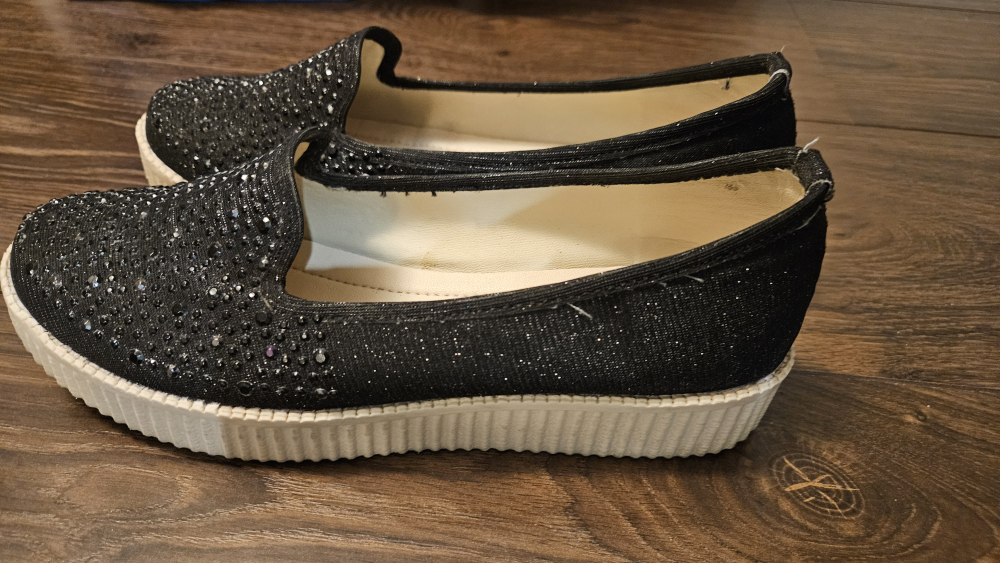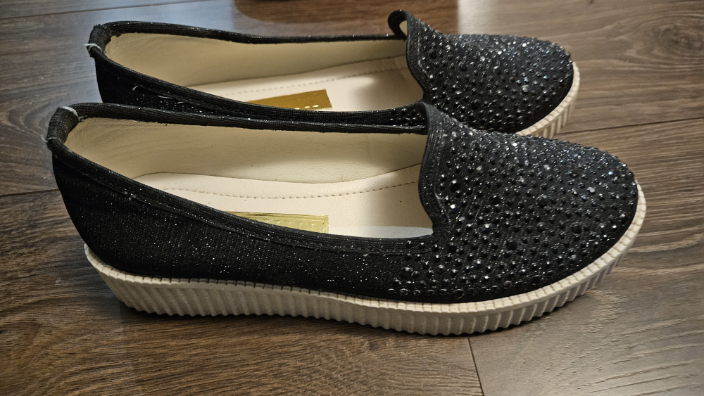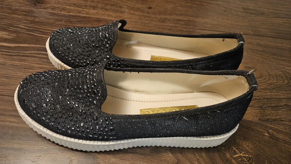 Black shoes with rhinestones. Slip-on style, and low comfortable wedge heel.