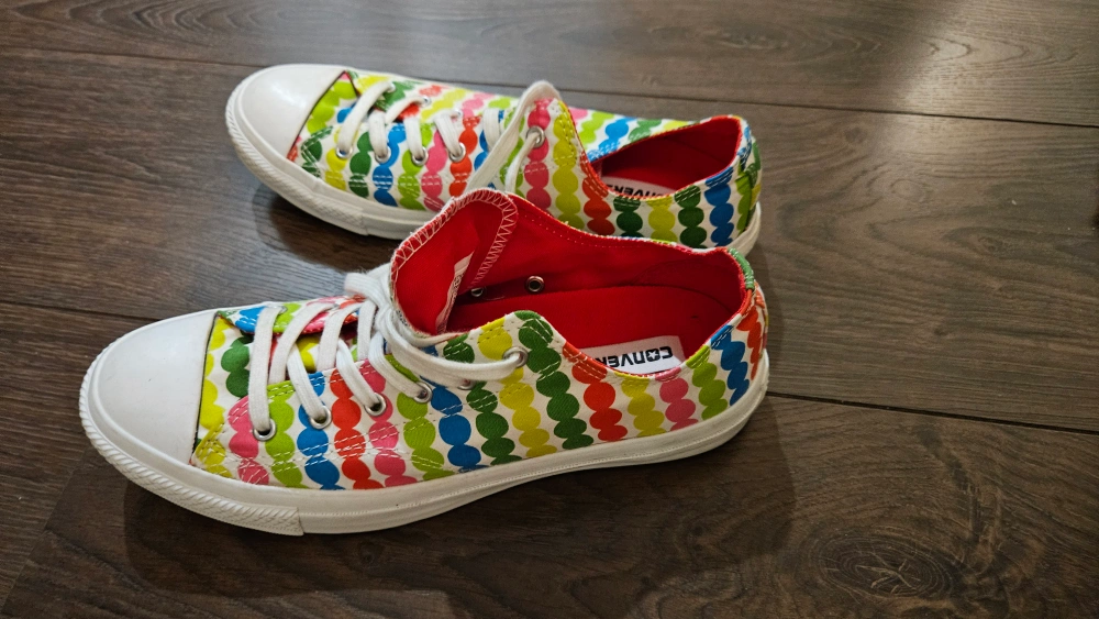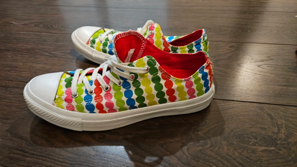Converse, Low-top sneakers with white soles and a multicoloured polka dot pattern. Barely used. Size 8
