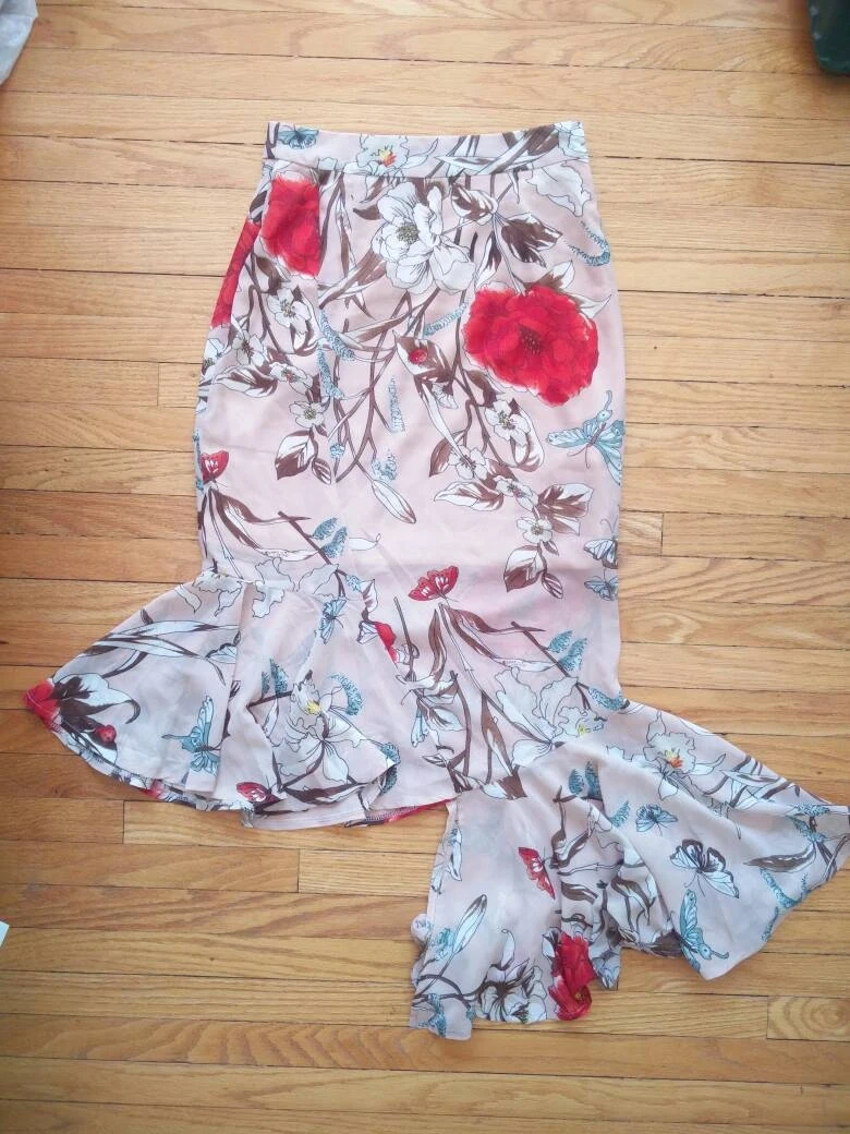 Long asymmetrical skirt with floral print. Cut begins as pencil skirt and flares asymmetrically. Outer layer is chiffon for flowing look. Zipper on side for easy wearing. Size is US 2. Excellent condition.