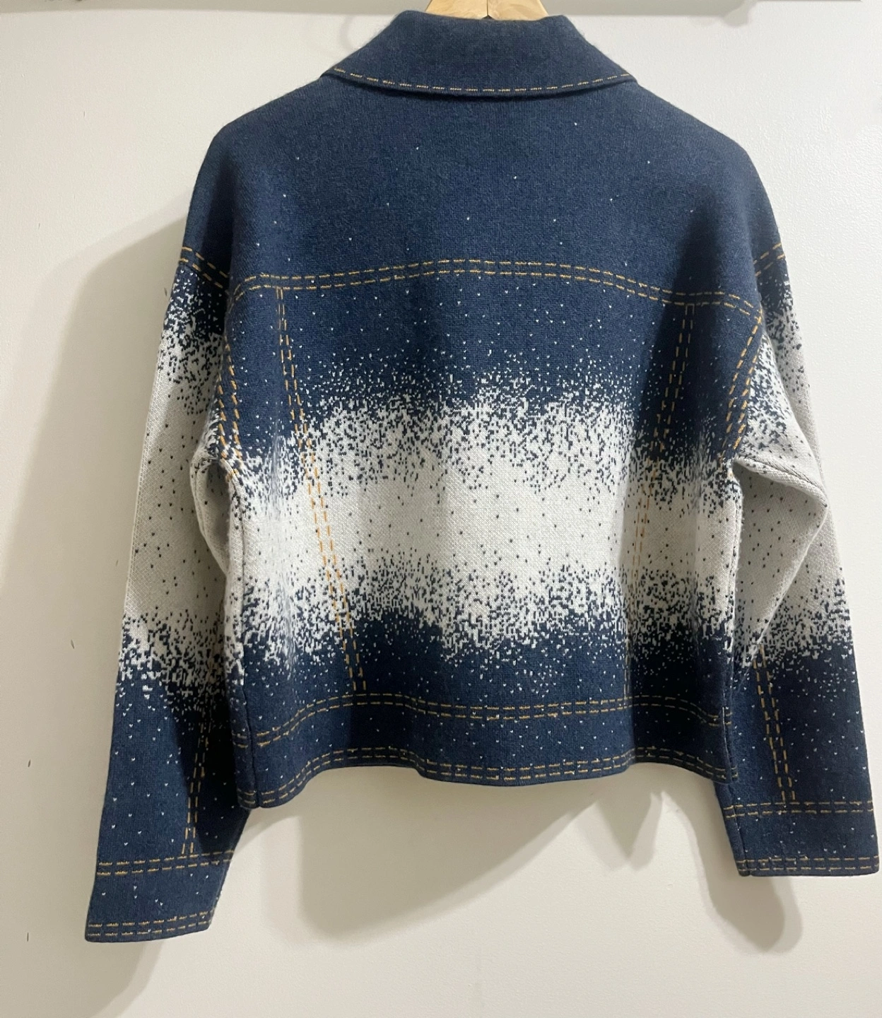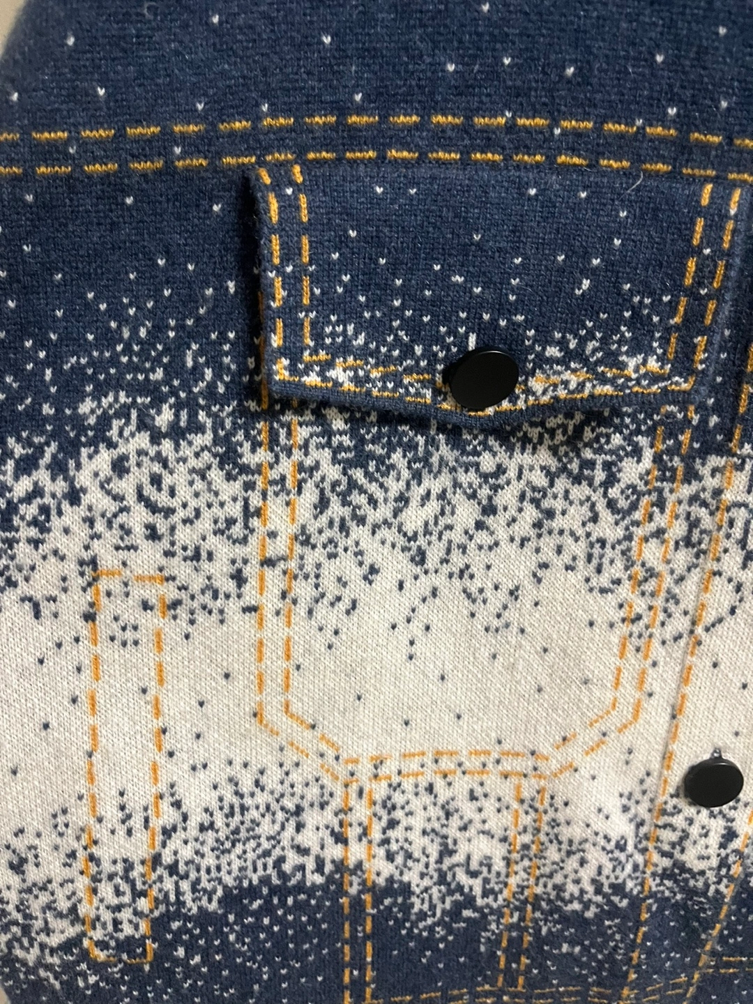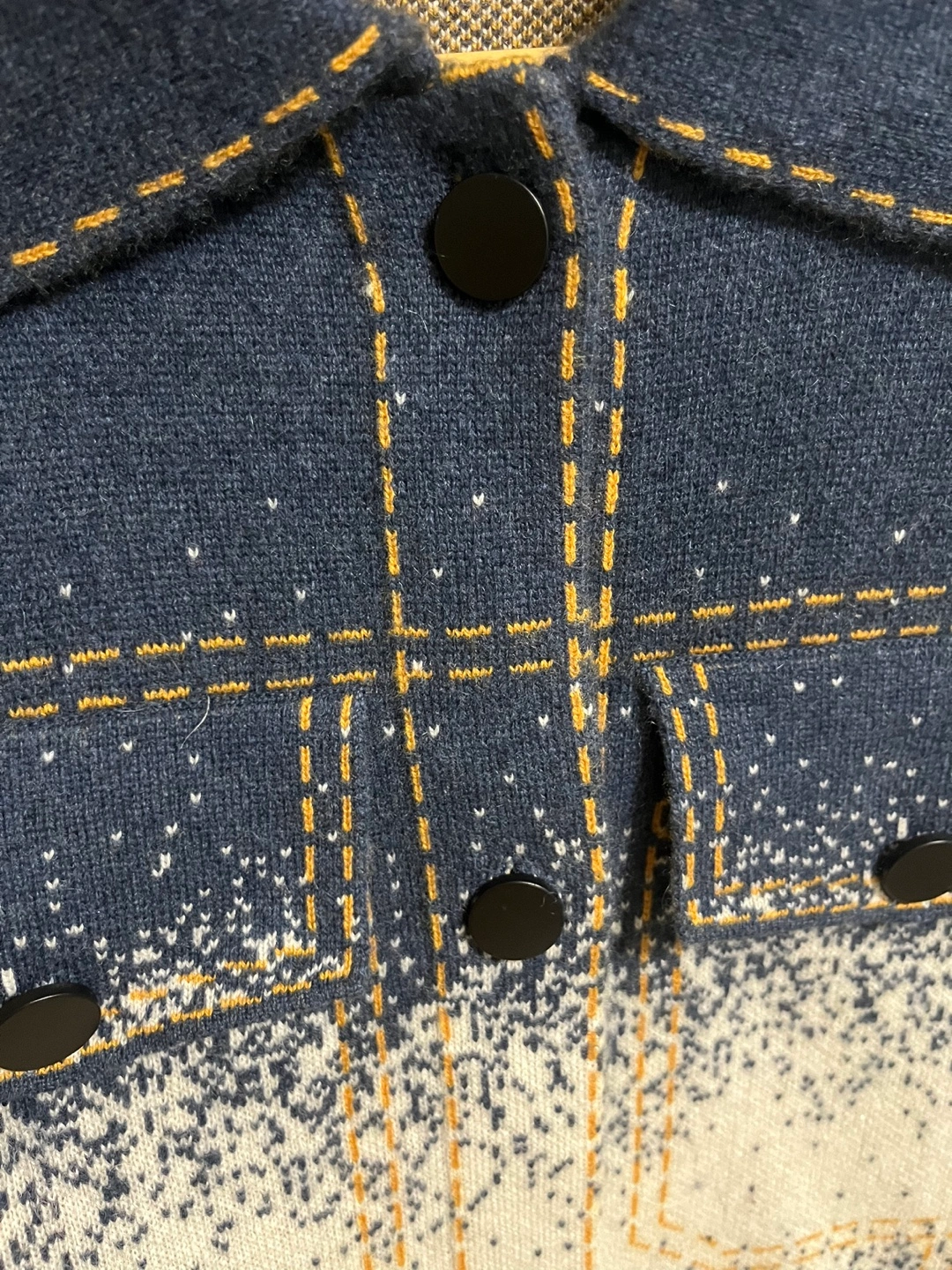 Cashmere sweater jacket with a blue and white patterned design. Features two pockets and button closures. Yellow stitching detail throughout.Cash only