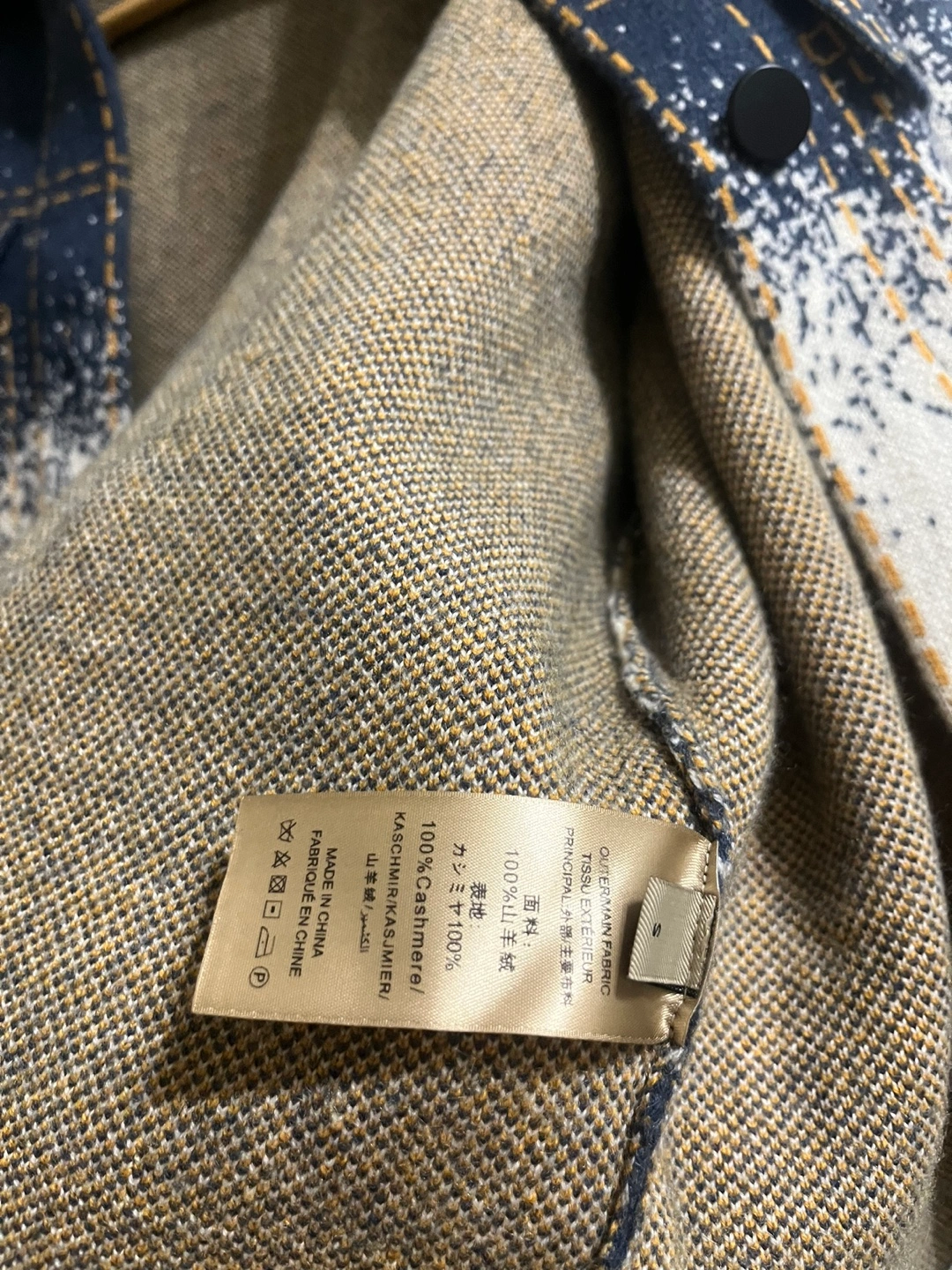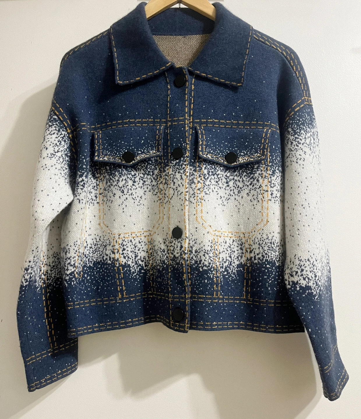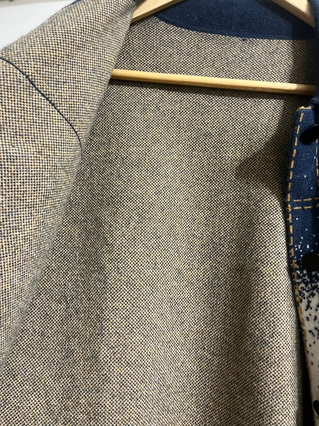 Cashmere sweater jacket with a blue and white patterned design. Features two pockets and button closures. Yellow stitching detail throughout.Cash only