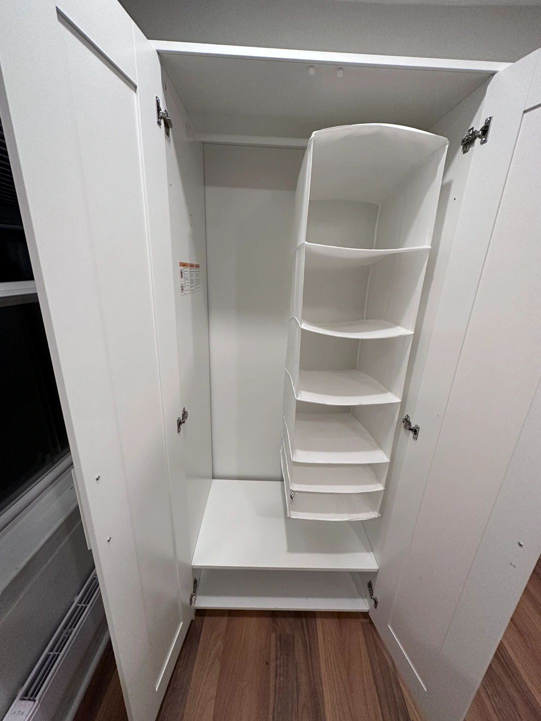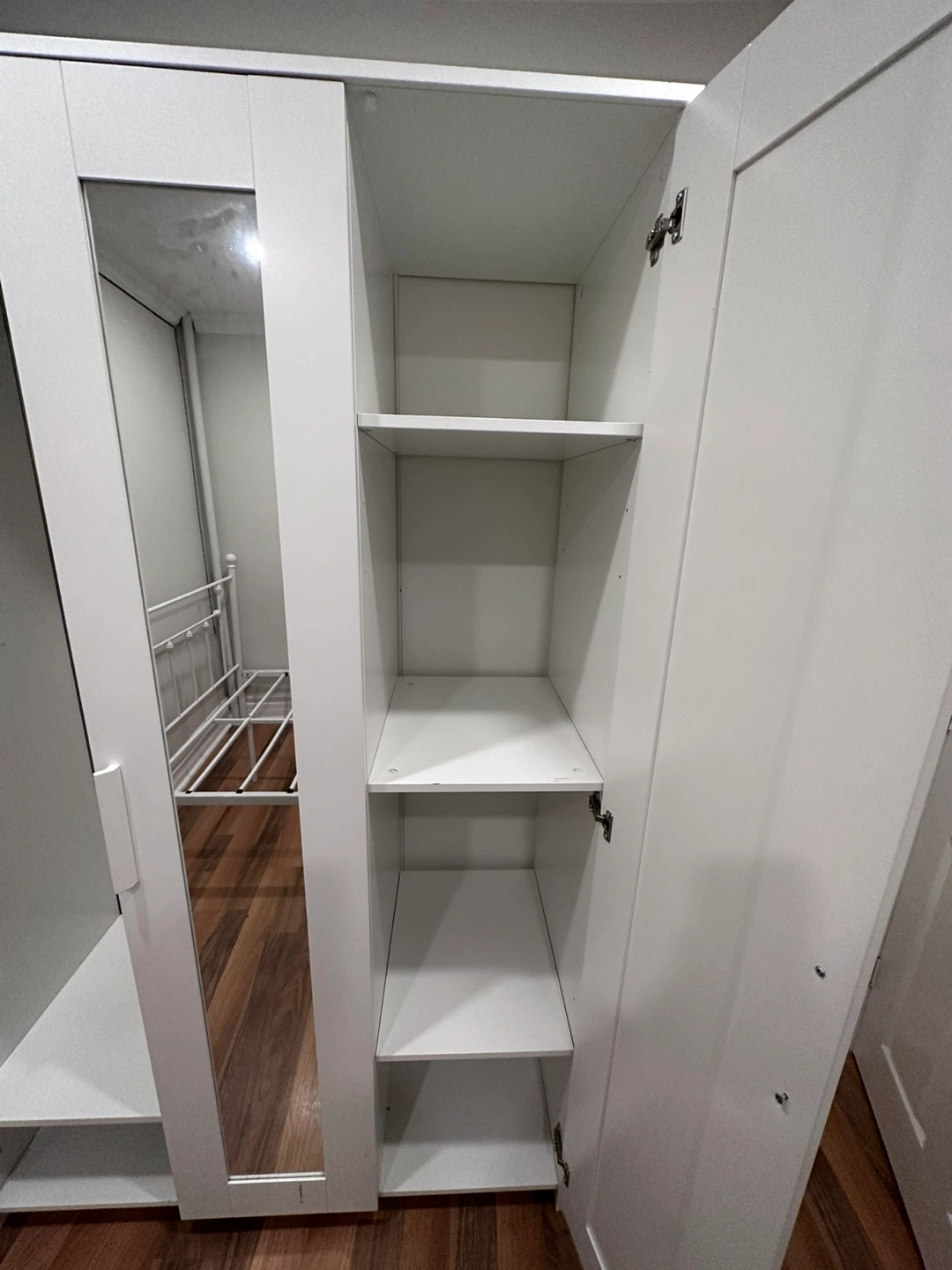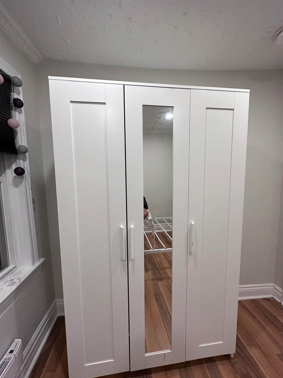 White Ikea Brimnes Cupboard in good condition! Has a lot of storage and also included with a hanging organizer from IKEA for extra storage. Includes hanging rod and a lot of shelves.