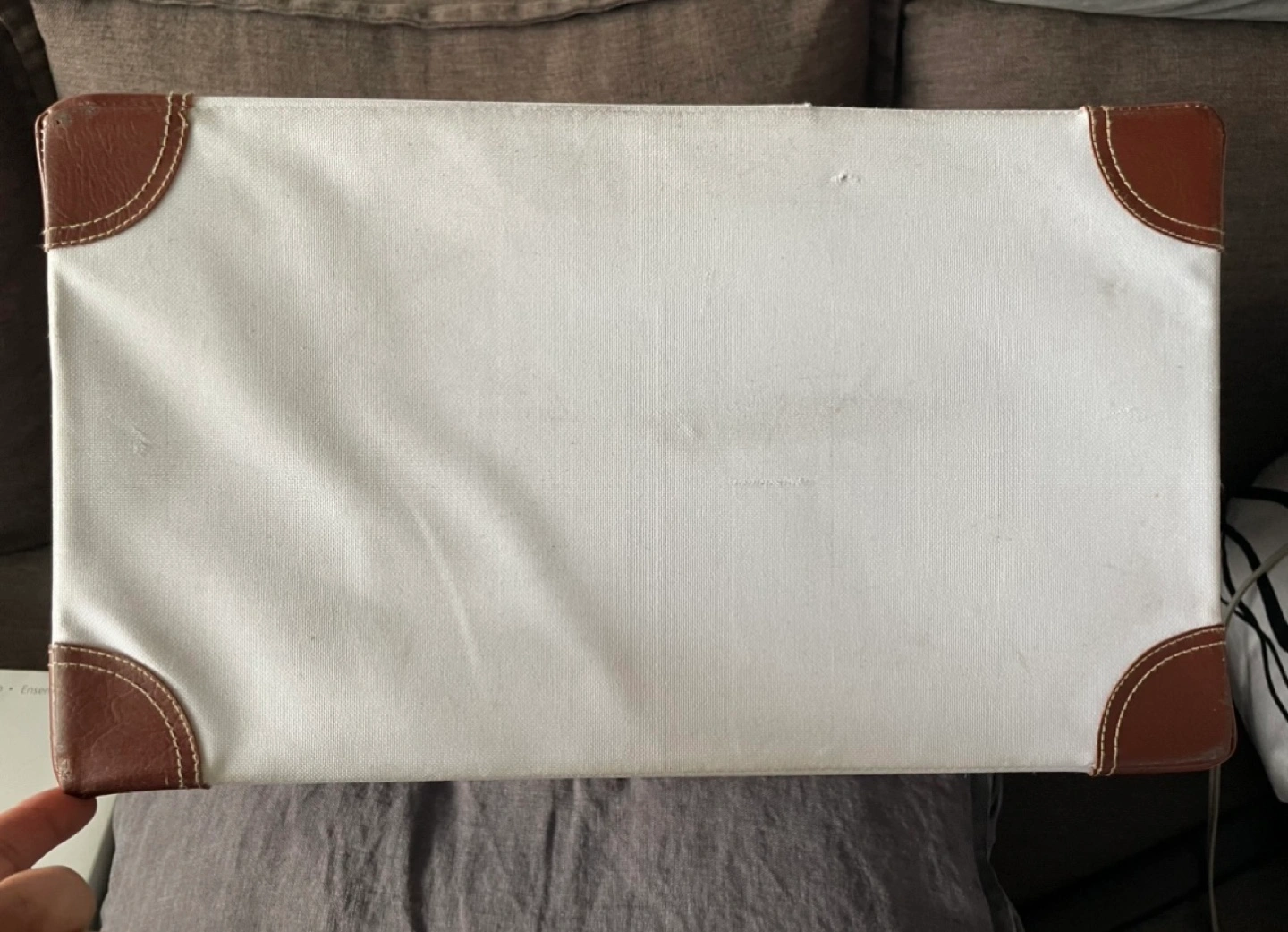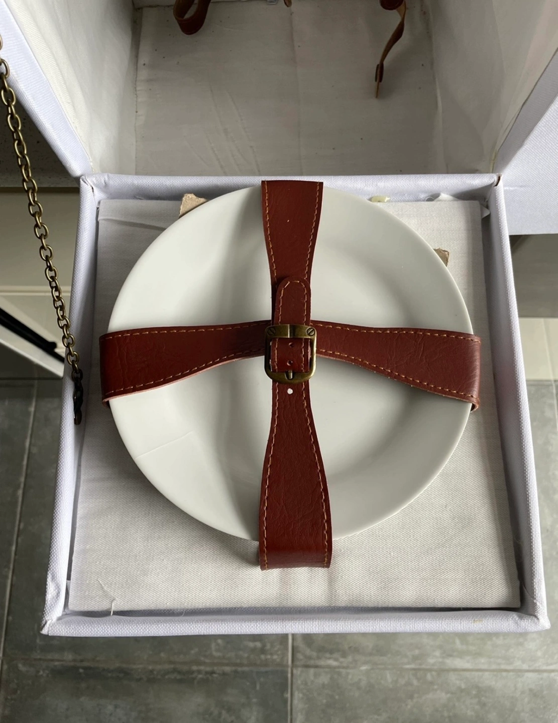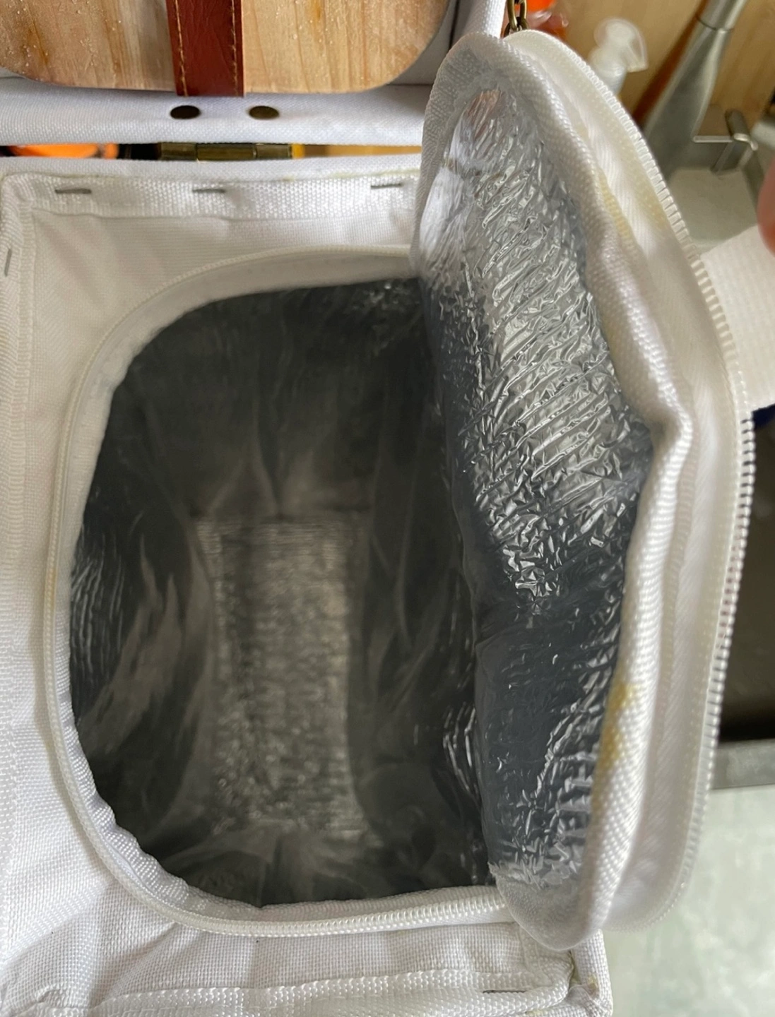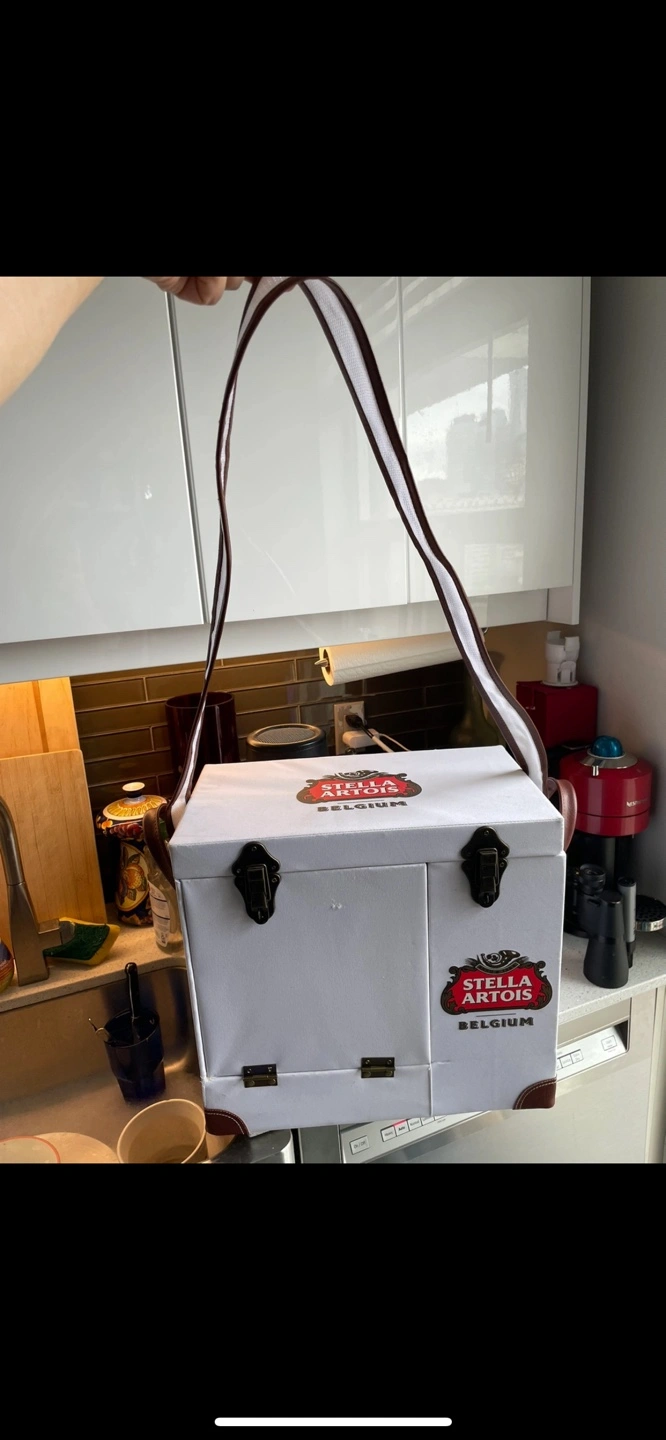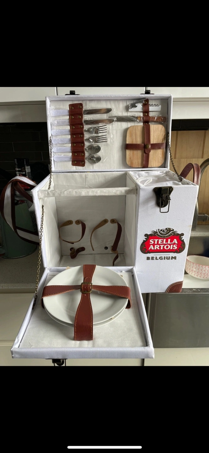 Picnic basket with cutlery, plates, cutting board, and bottle opener. Includes a shoulder strap. Small zipper on the cooler doesn’t work otherwise in perfect condition