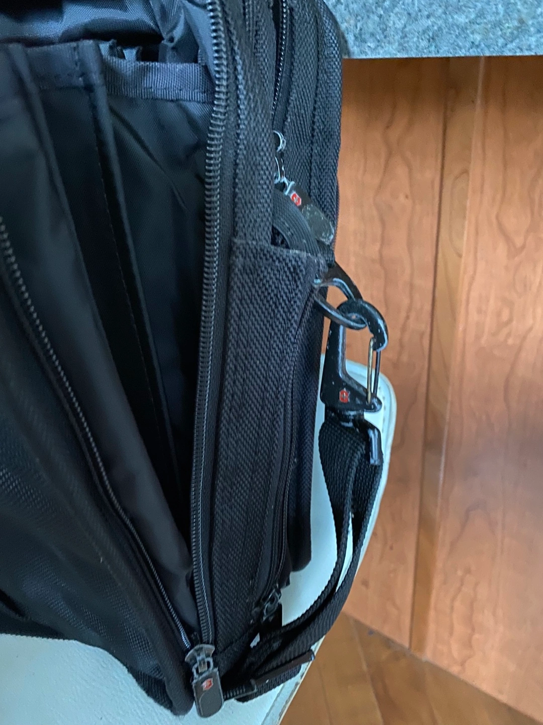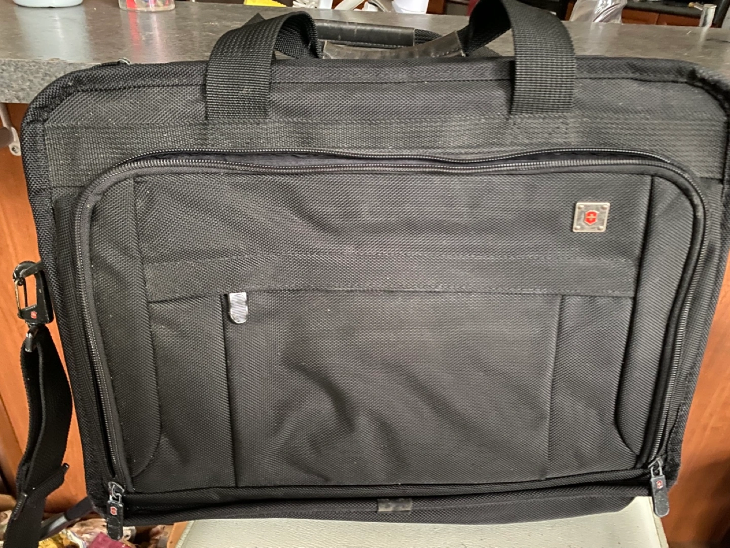 53Black laptop bag with multiple pockets, a detachable shoulder strap, and a handle. It appears to be in good condition, and features a zippered compartment that opens to reveal more pockets. Size 46x33x14 cm